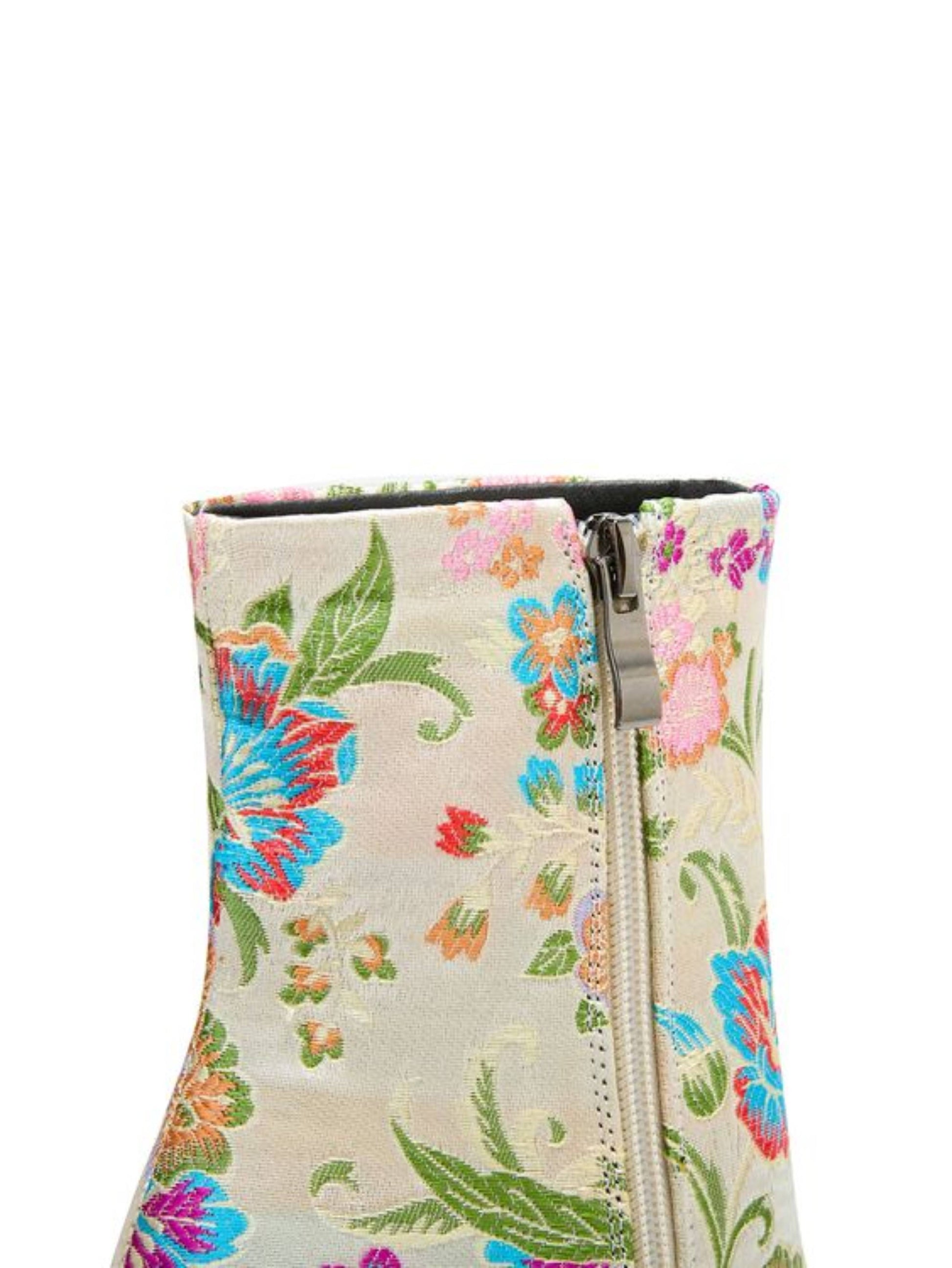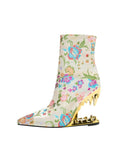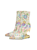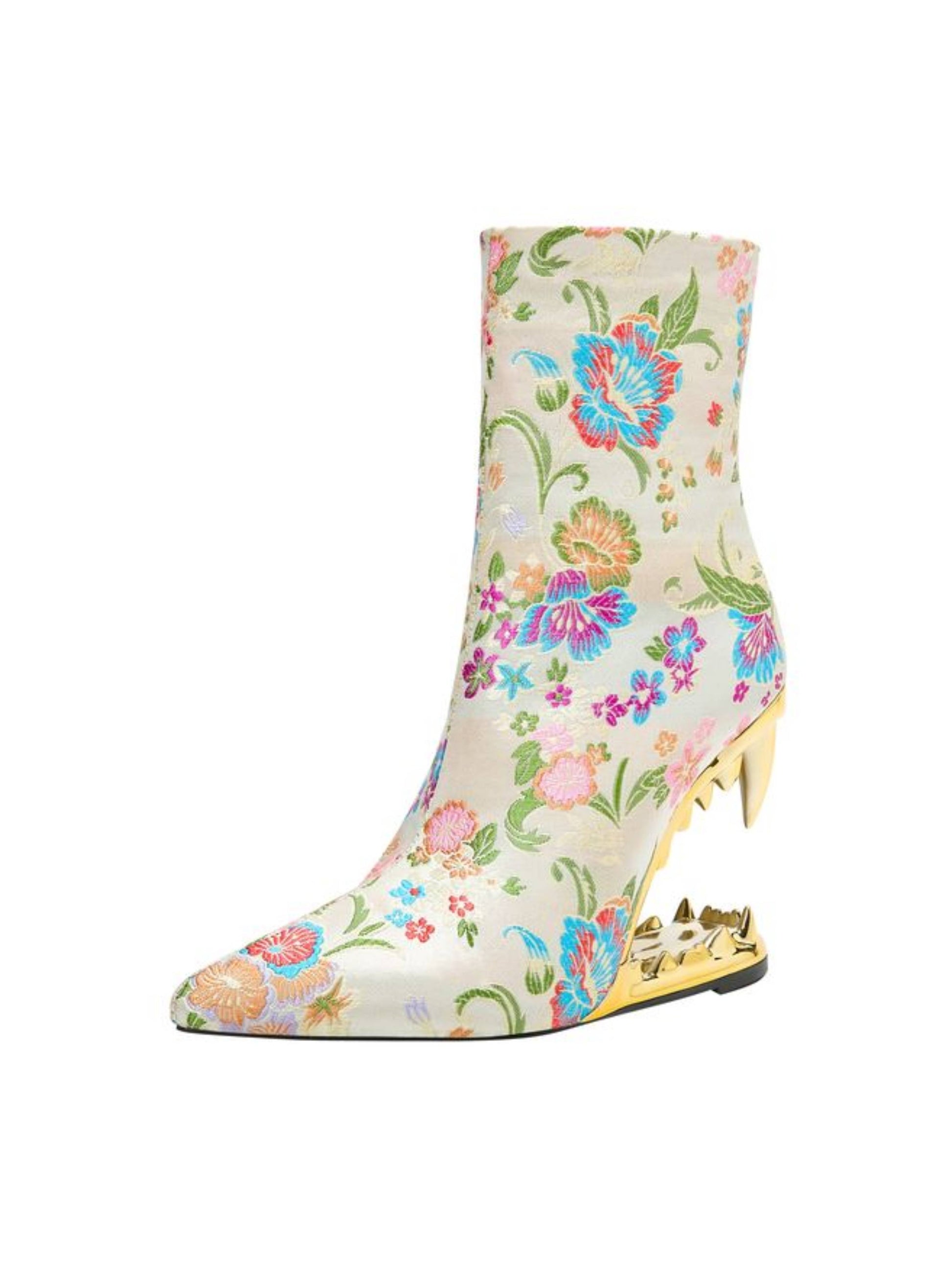 Tiger Teeth Heel Pointed Toe Classic Floral Ivory Ankle Boots