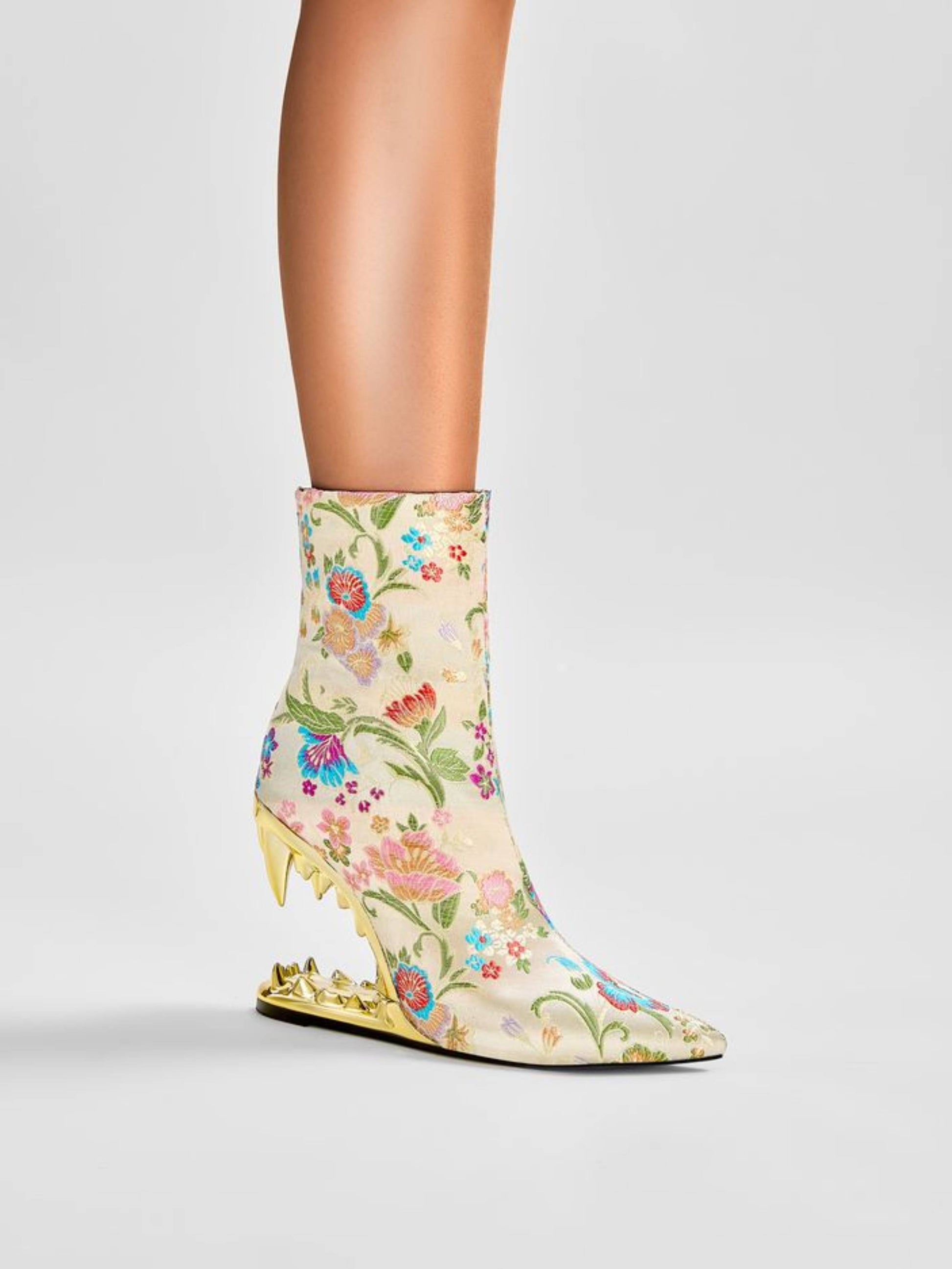 Elegant ivory ankle boots with classic floral embroidery, distinctive tiger teeth heel, and sophisticated pointed toe. These romantic vintage-inspired boots blend delicate floral patterns with unique sculptural heels, perfect for those seeking embroidered ankle boots and timeless ivory floral footwear.