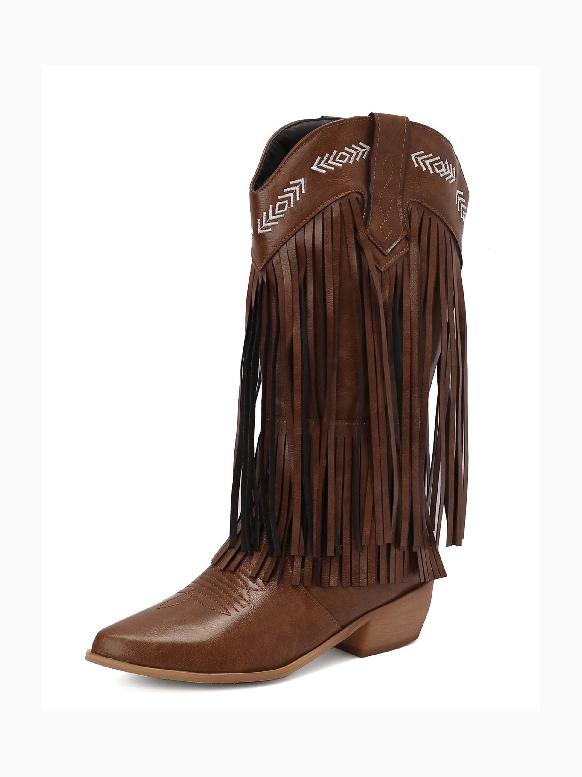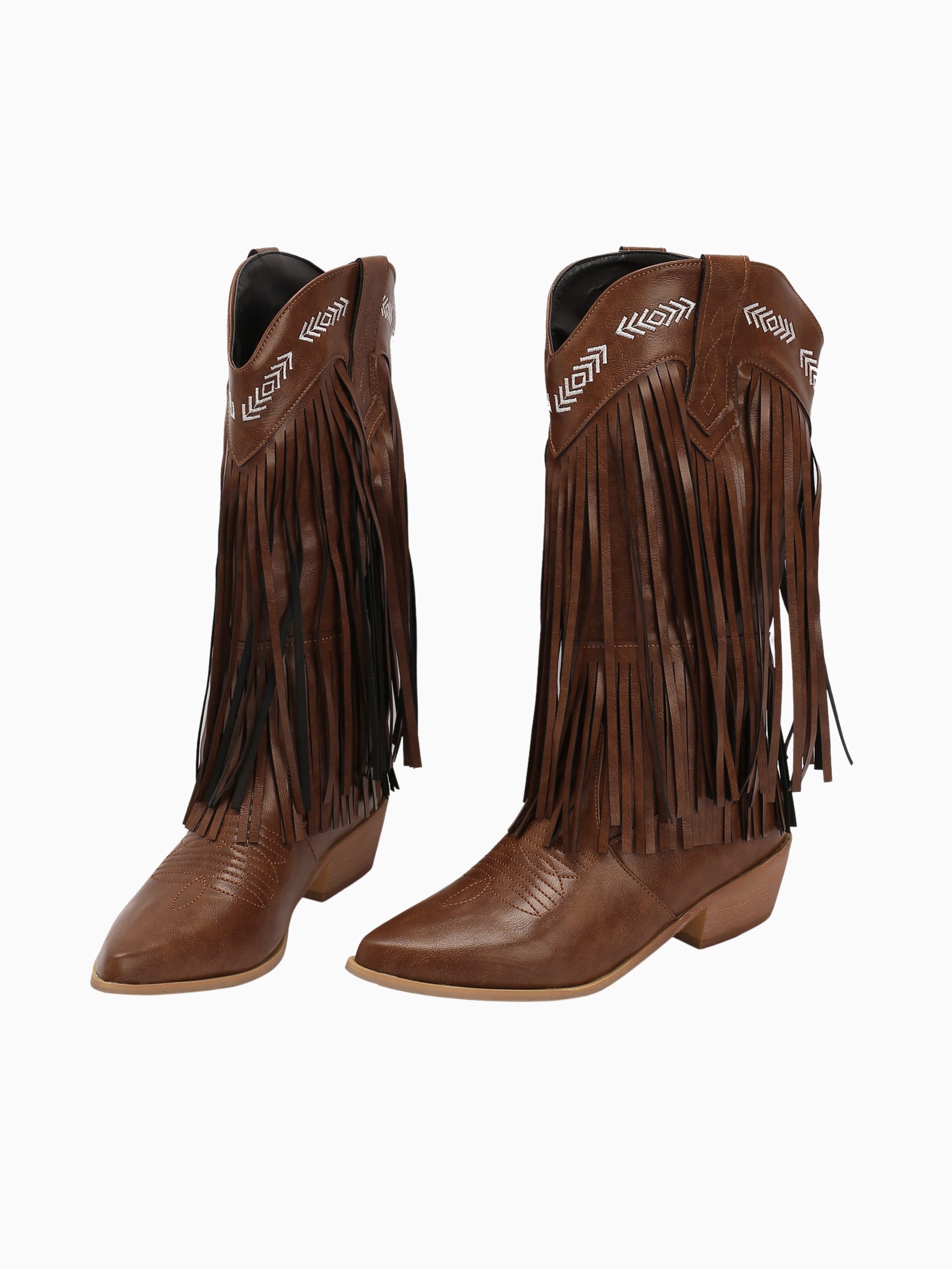 Bohemian dark brown mid-calf cowgirl boots featuring dramatic side fringe and tribal arrow embroidery, blending Native American inspiration with classic Western style.