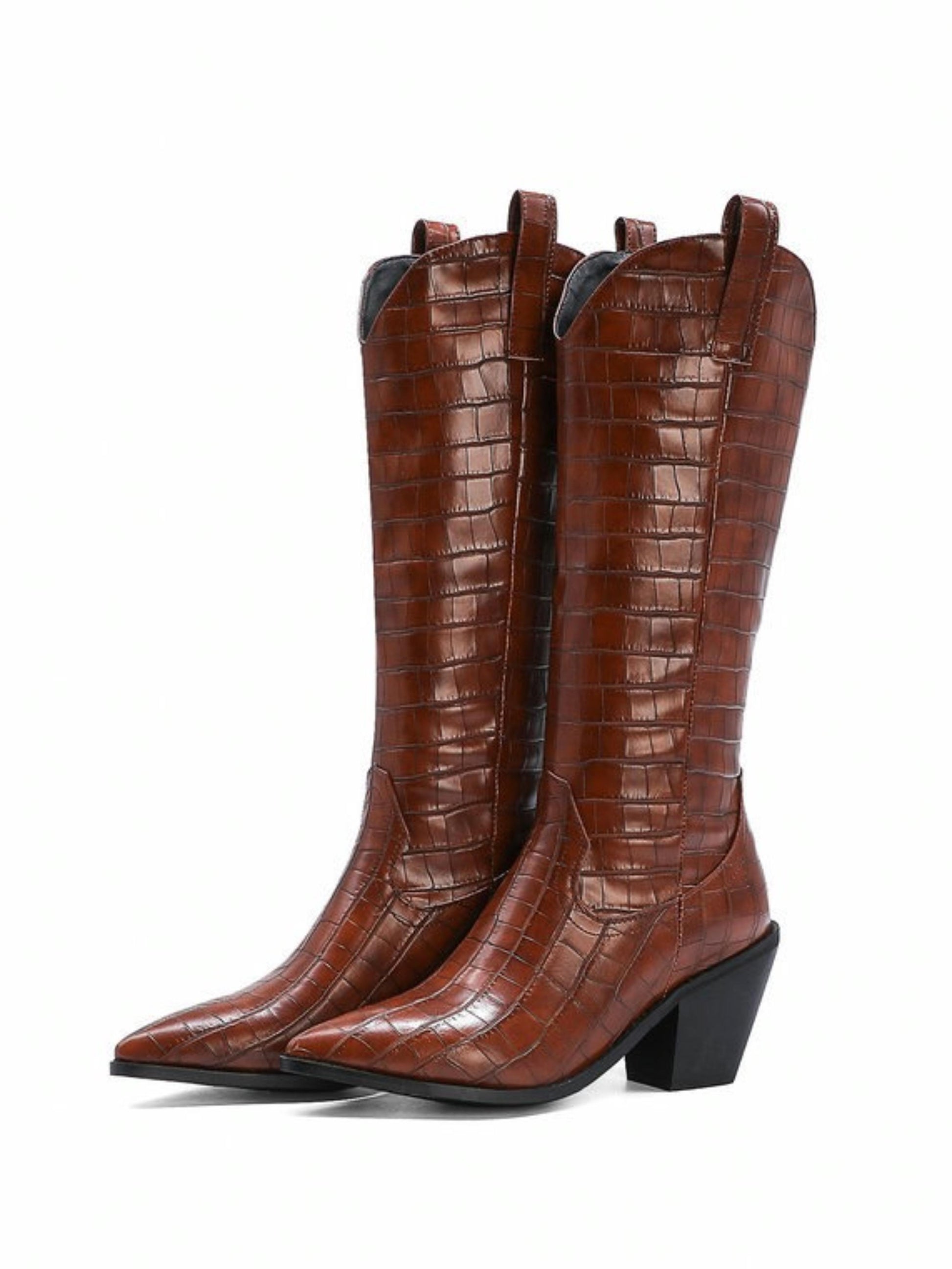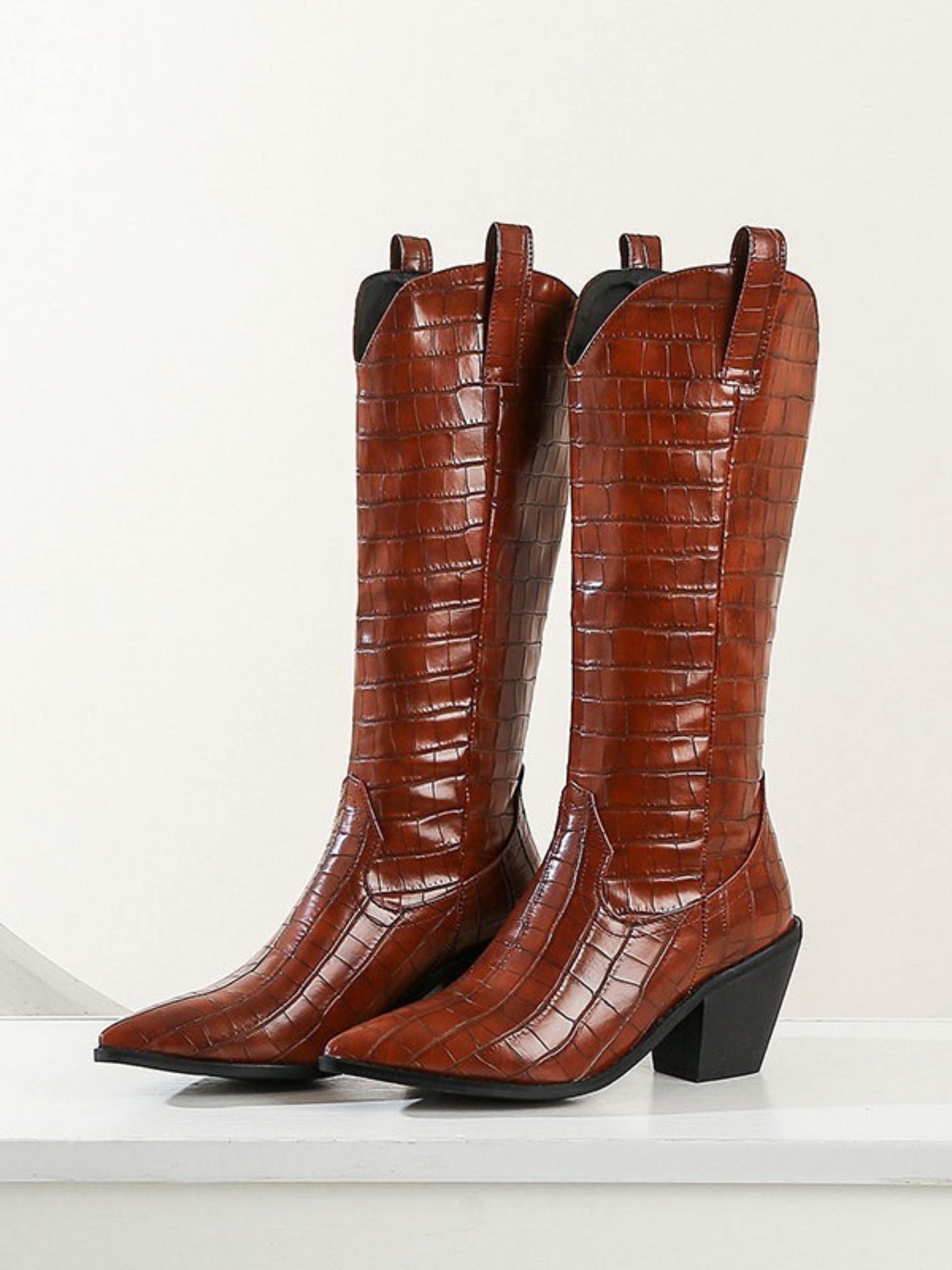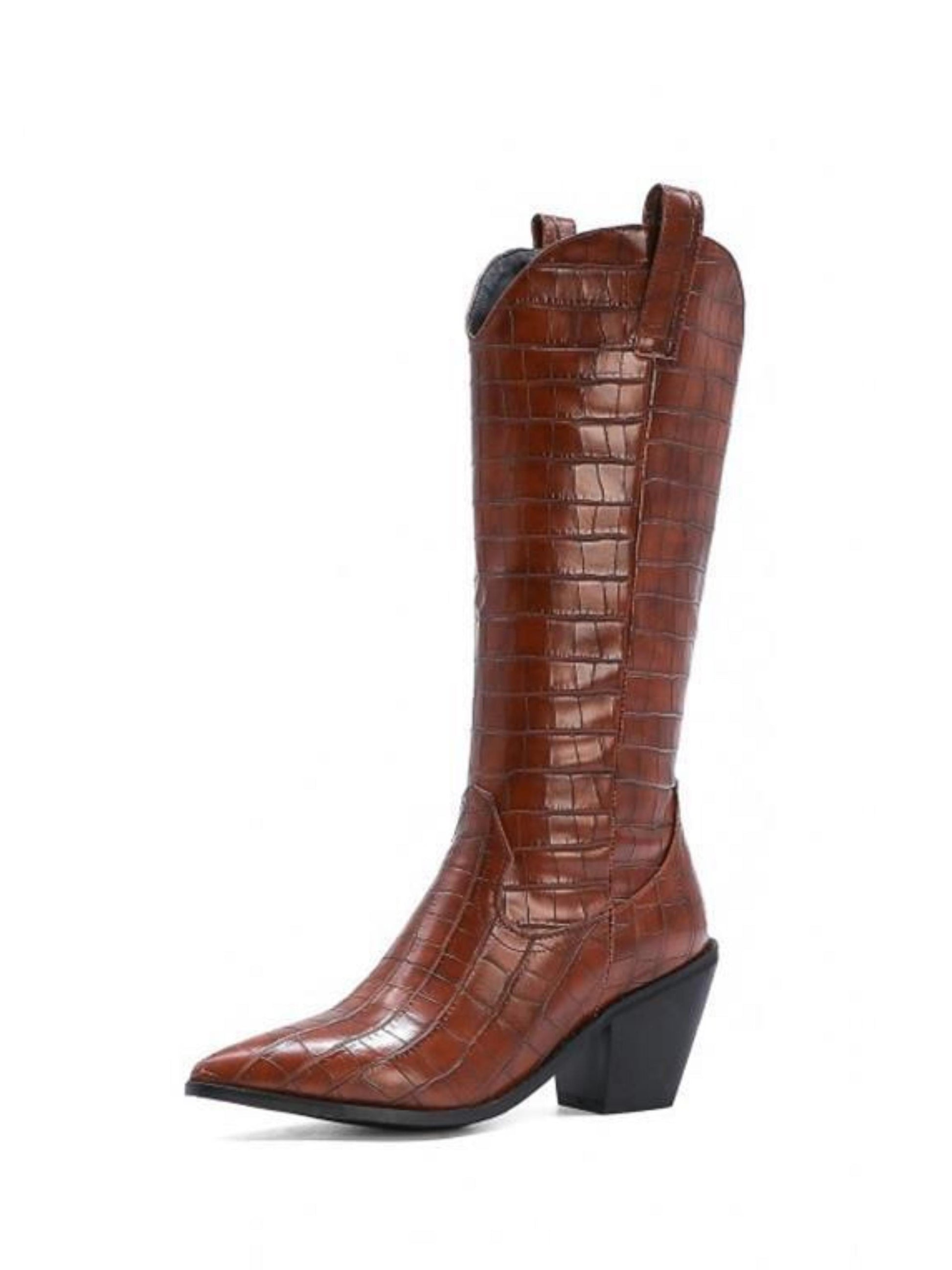 Vintage Dark Brown Lizard Pattern Snip Toe Heeled Western Boots