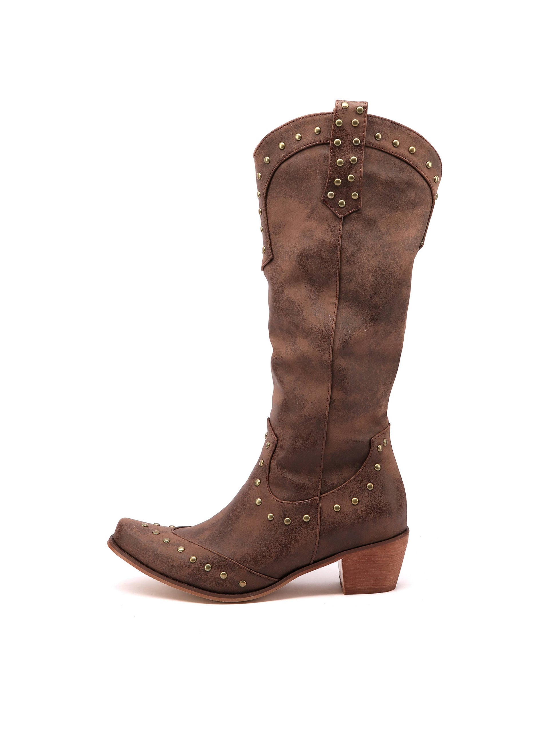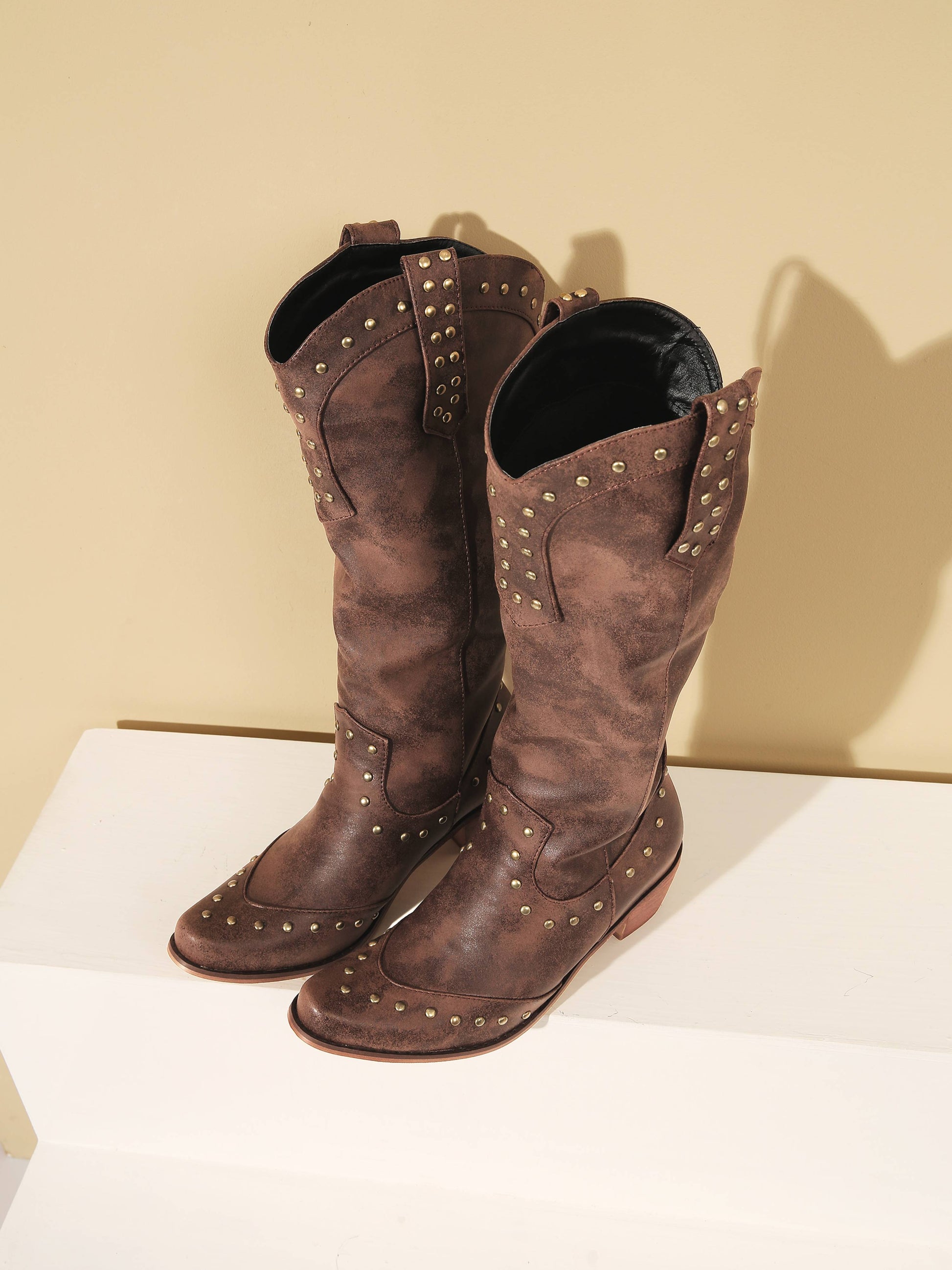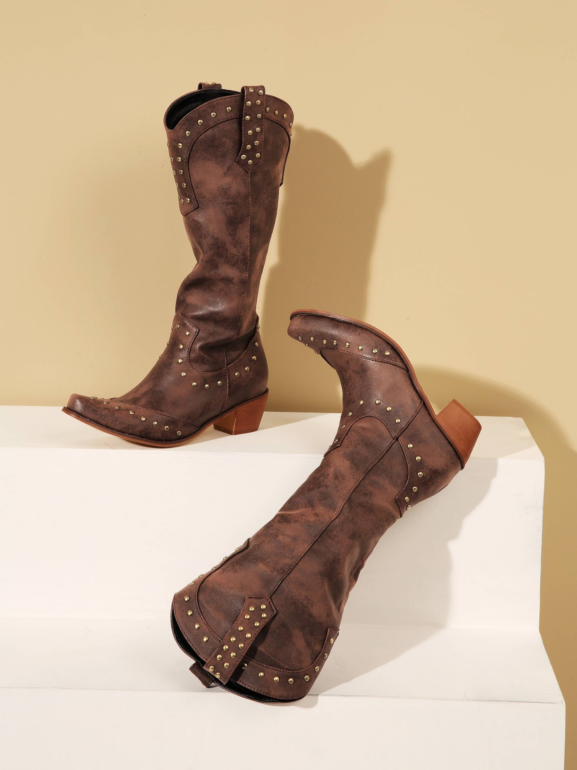 Vintage Brown cowgirl boots featuring a mid-calf length, studded accents, and snip-toe, blending Western style with bohemian flair.