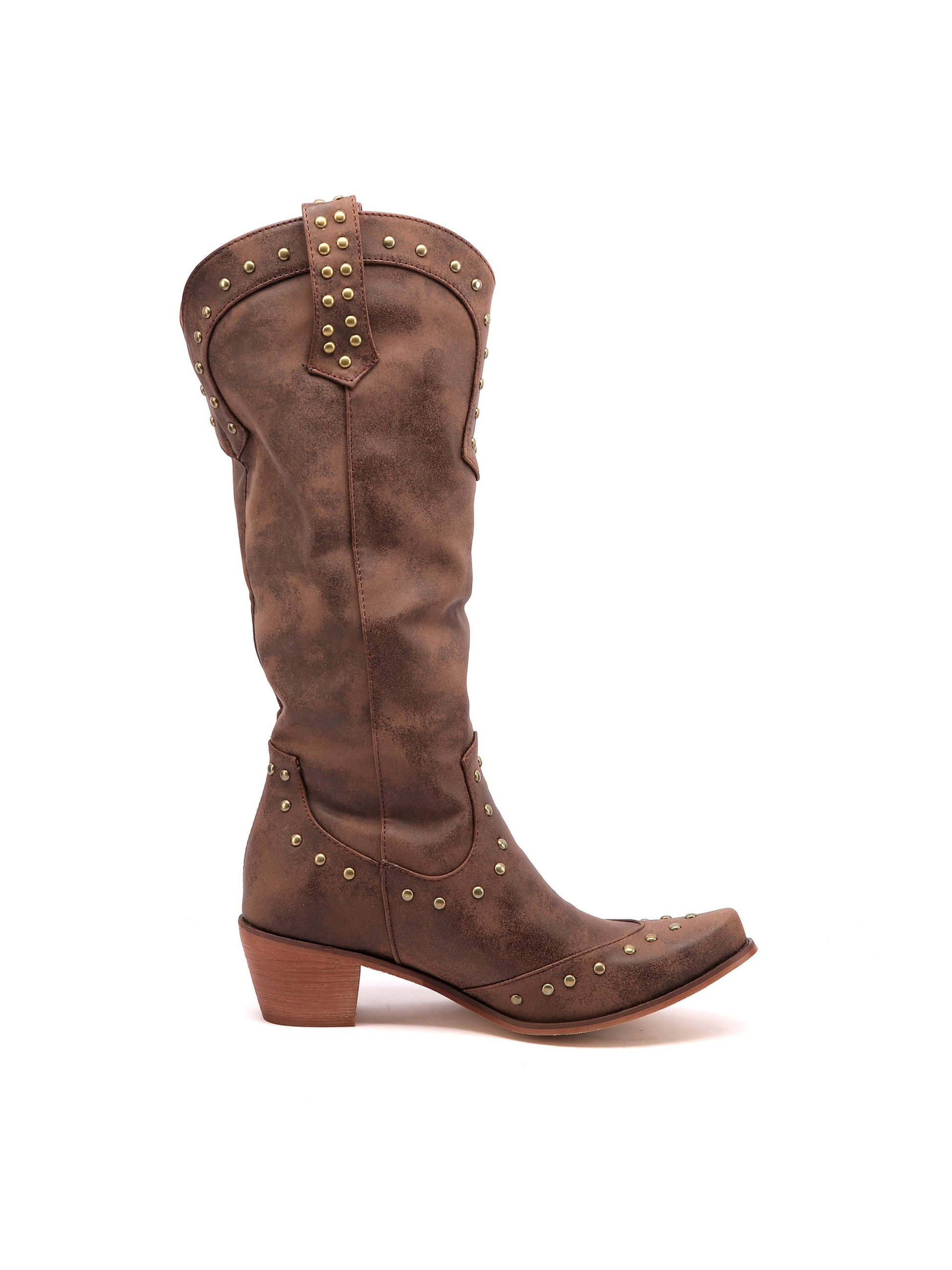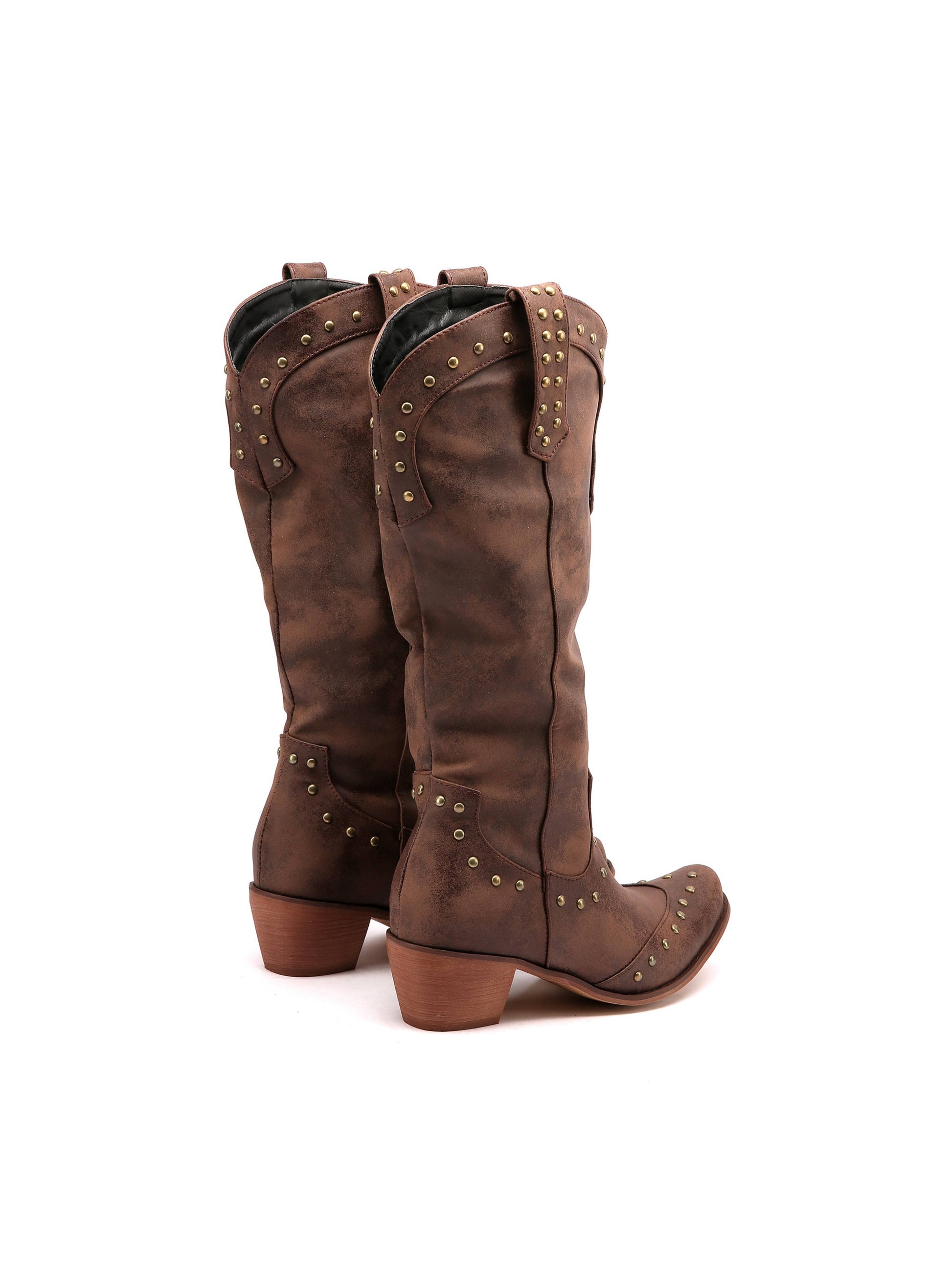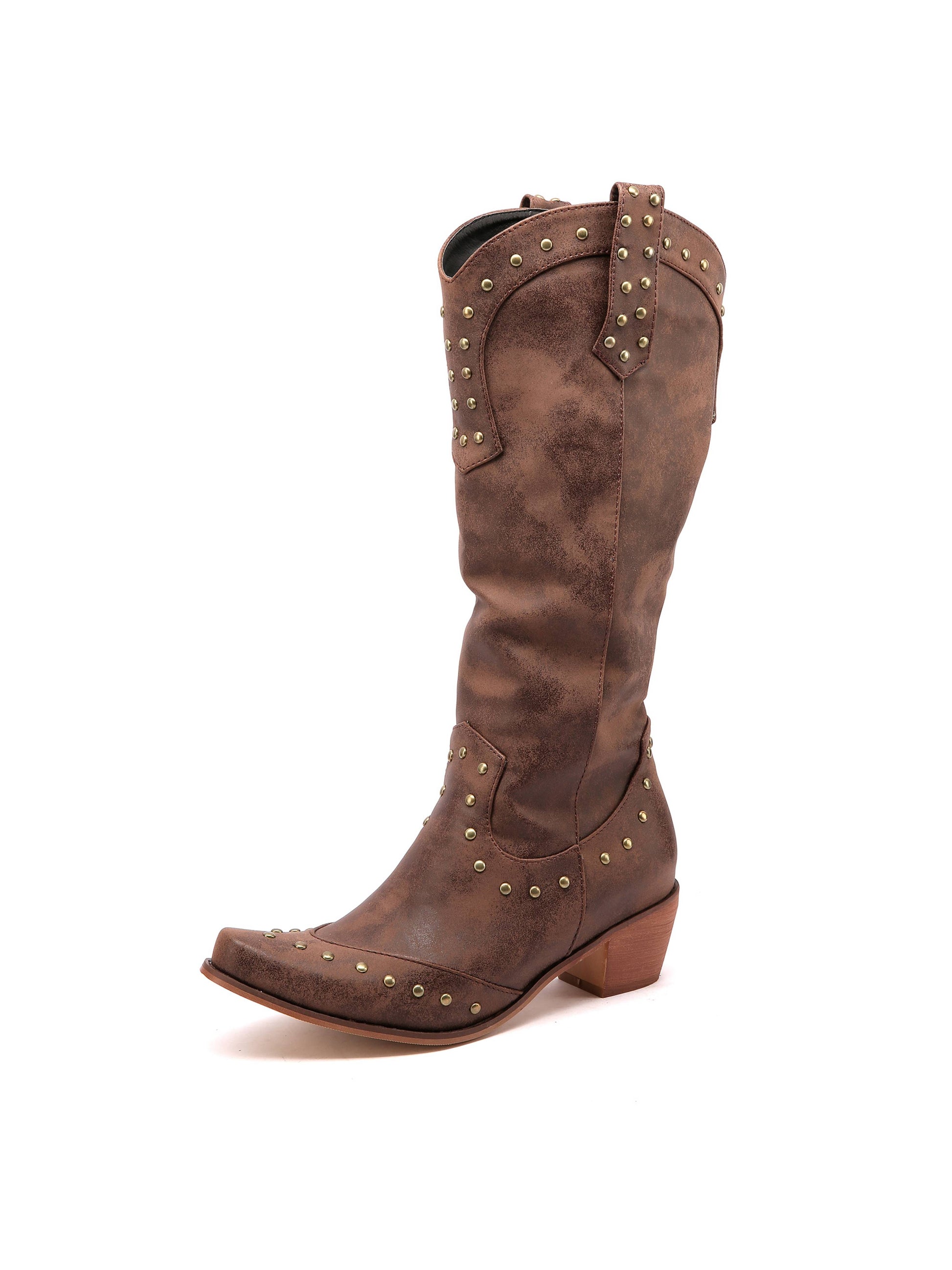 Vintage Brown cowgirl boots featuring a mid-calf length, studded accents, and snip-toe, blending Western style with bohemian flair.