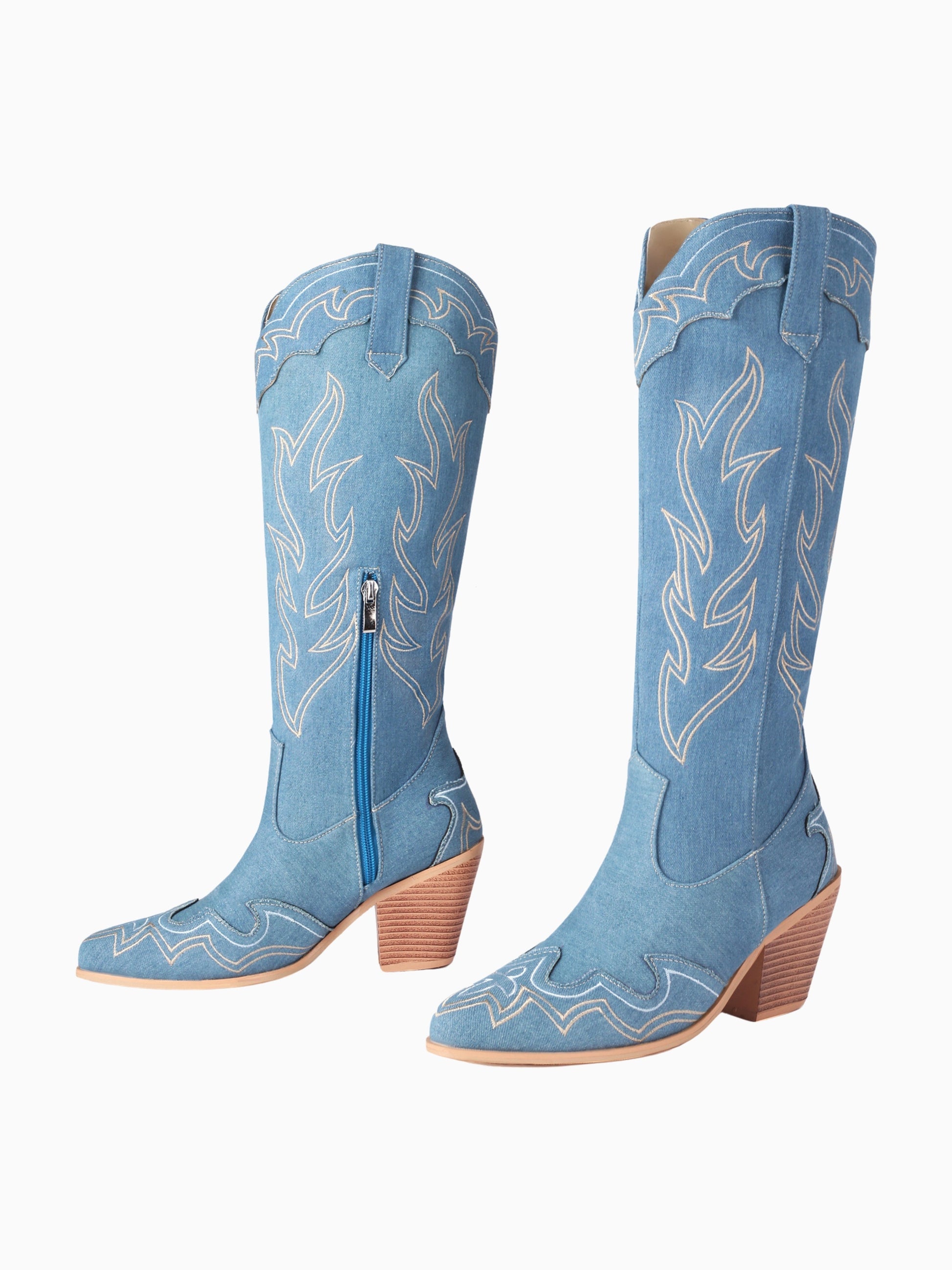 Denim Blue Knee-High Heeled Western Cowgirl Boots for Women