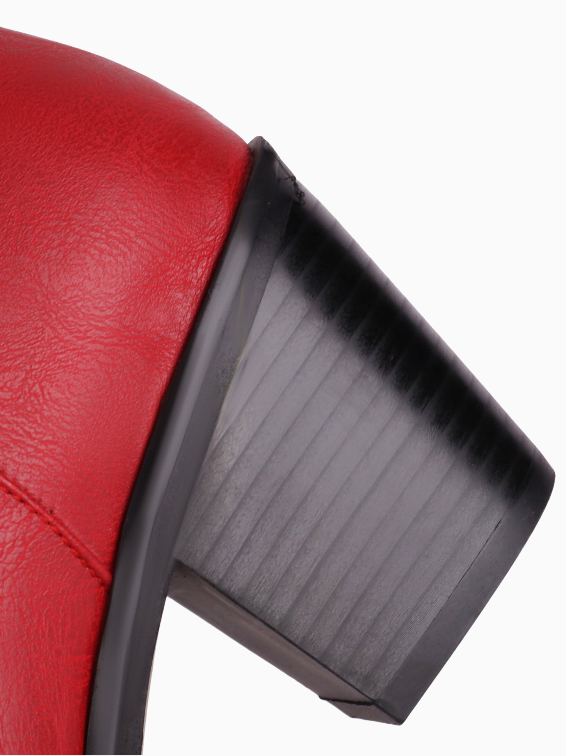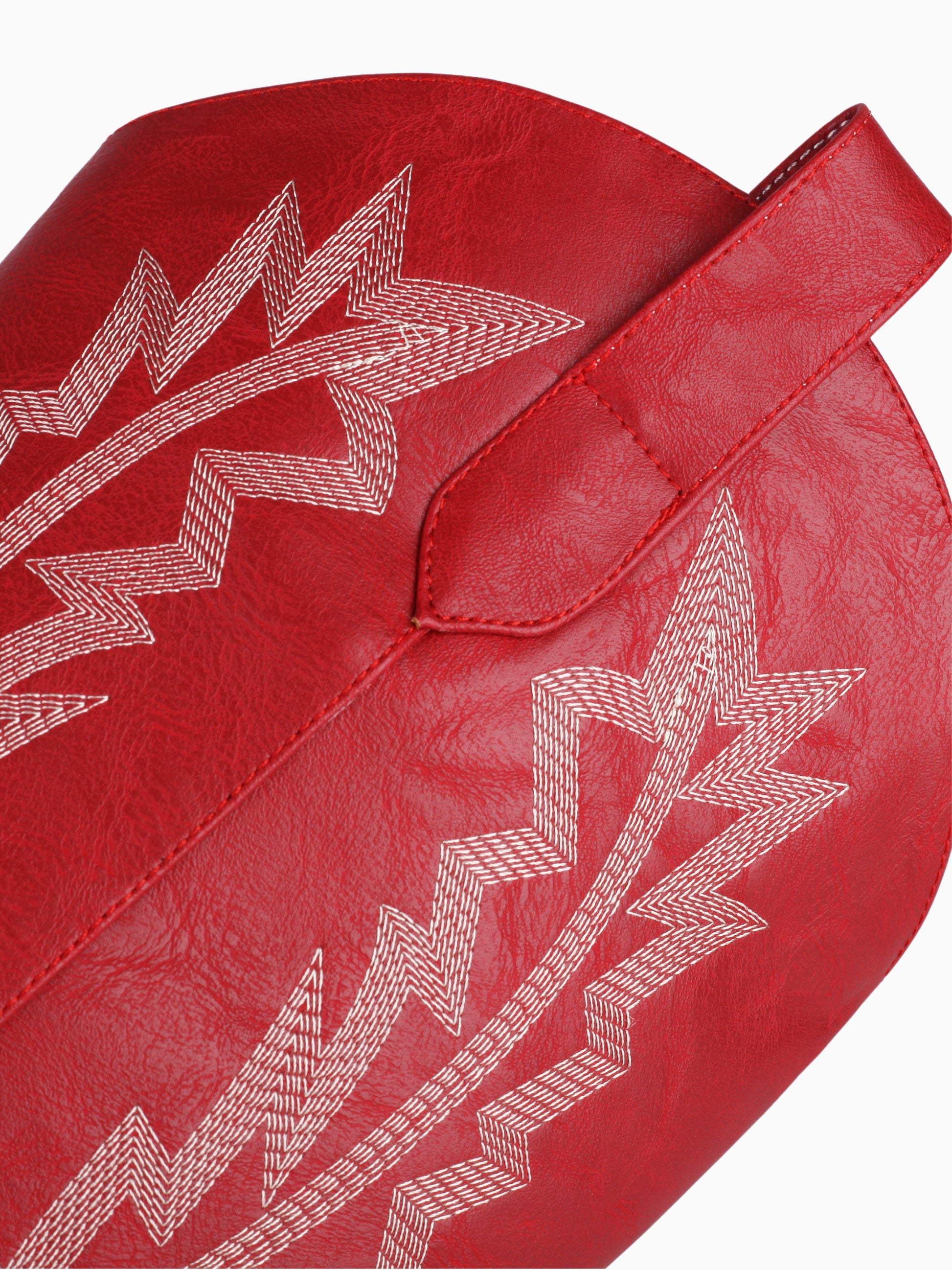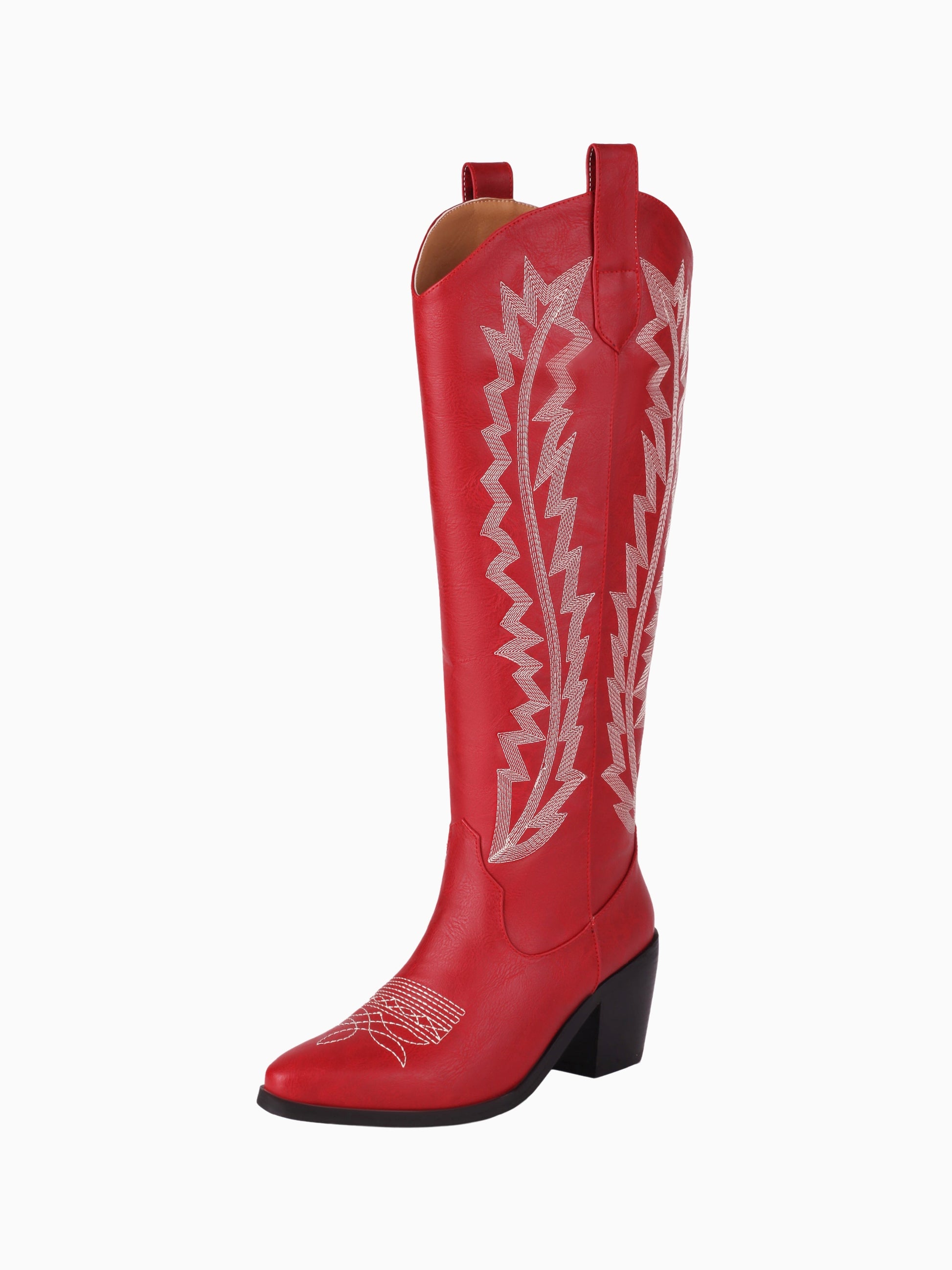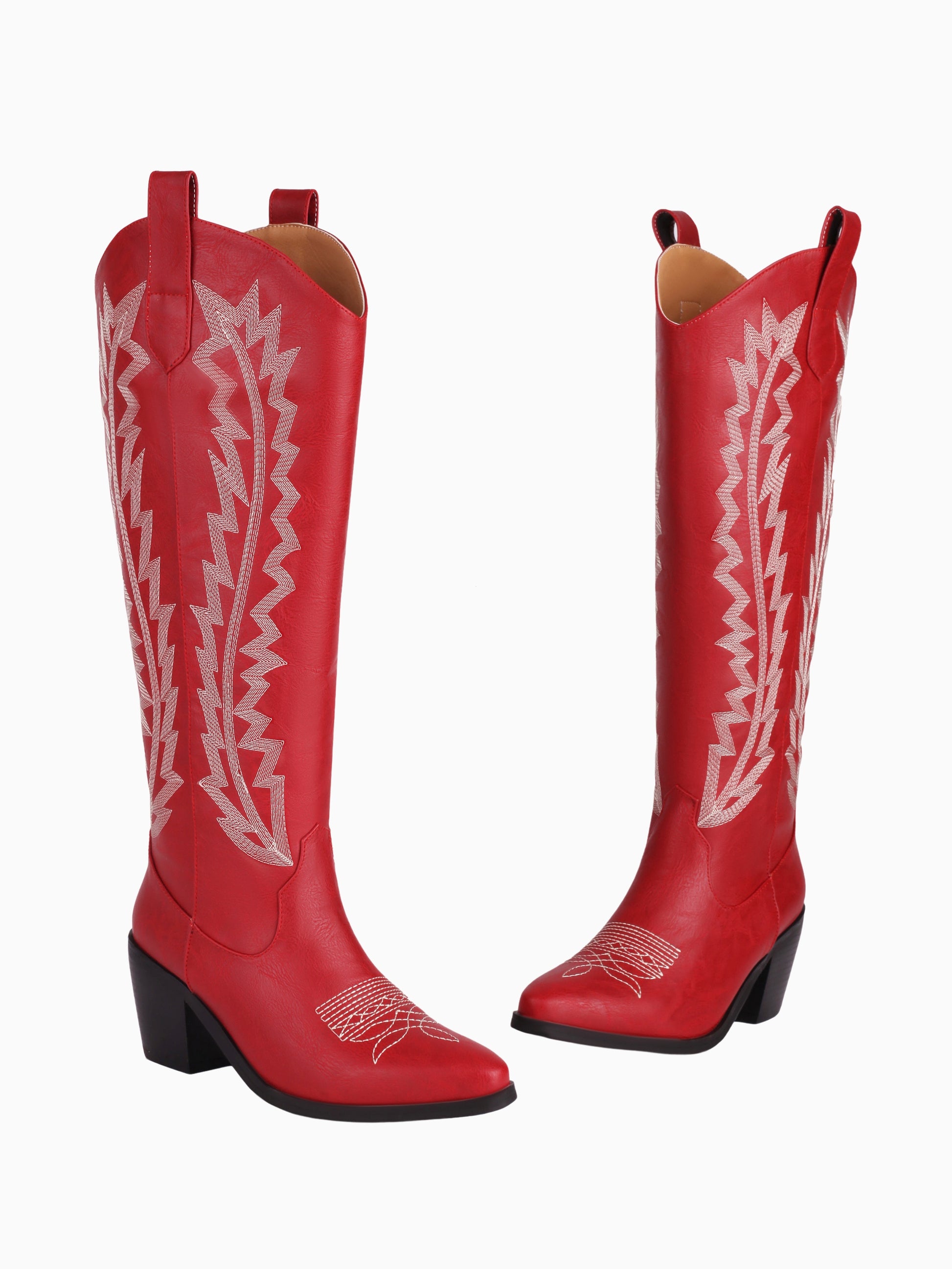Bold knee-high cowgirl boots in vibrant red synthetic feature striking white embroidered patterns, and stacked heels for Western style.