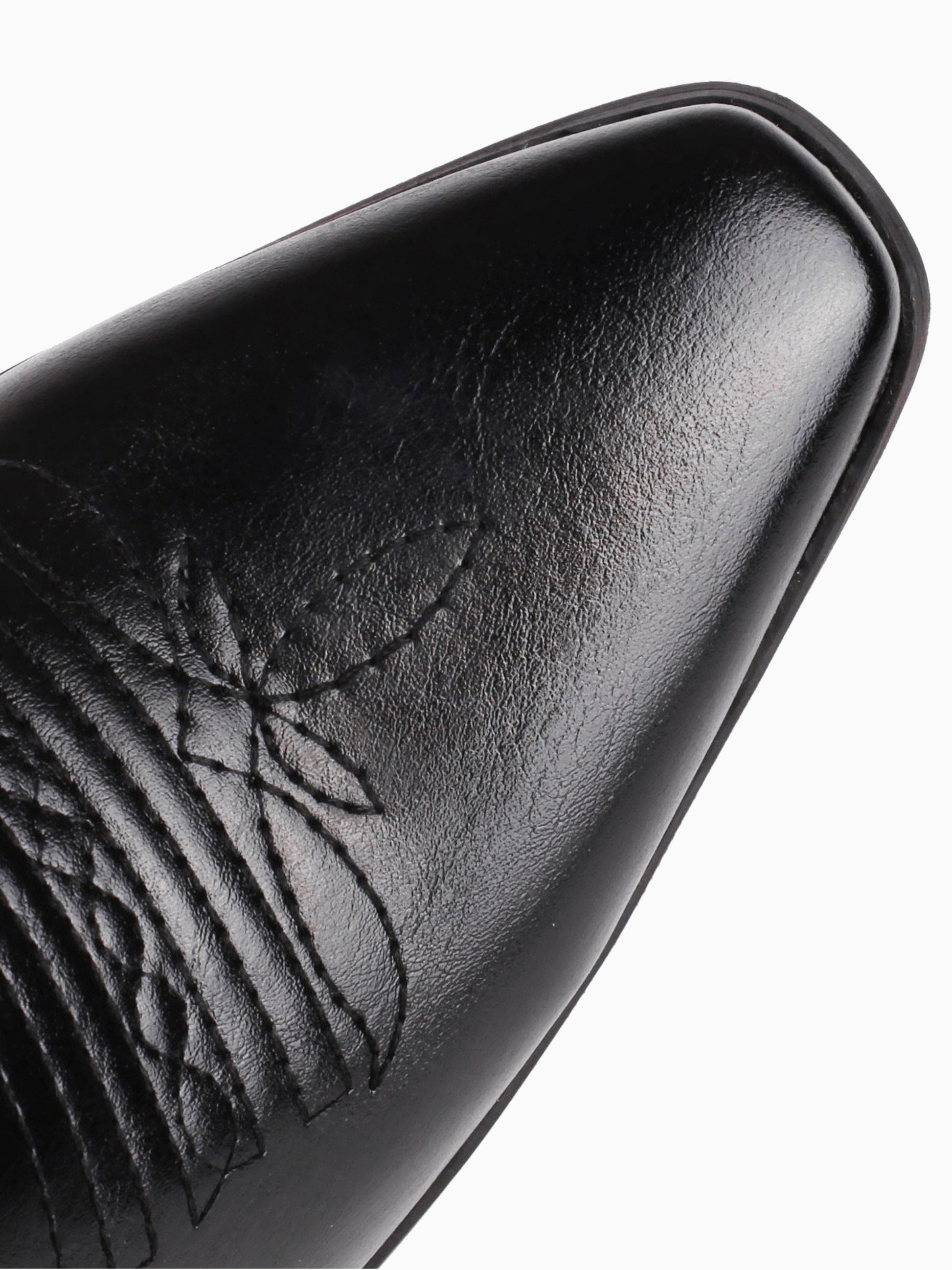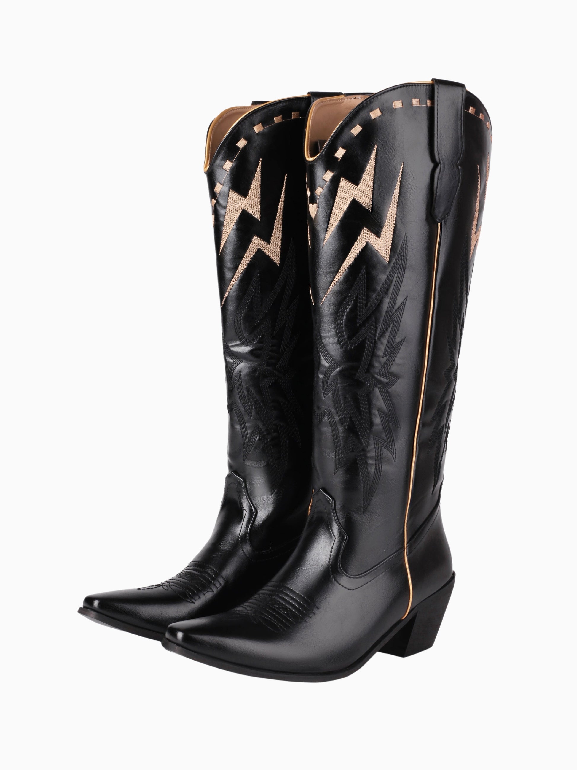 Edgy knee-high cowgirl boots in glossy black synthetic feature striking rose-gold embroidered lightning inlay, squared snip toe, and western block heel for modern flair.