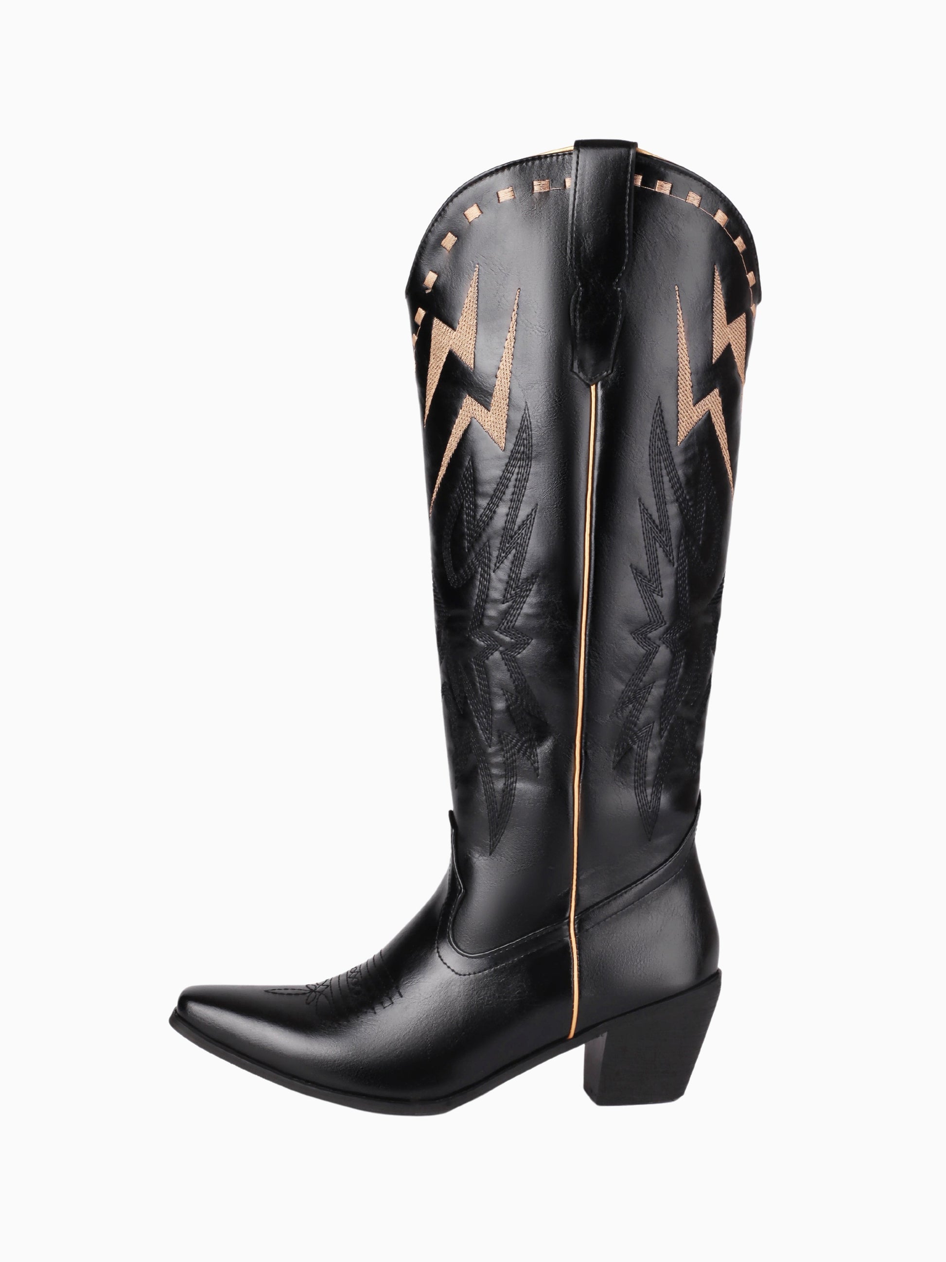Lightning Inlay Knee High Black Cowgirl Boots Snip Toe