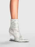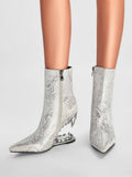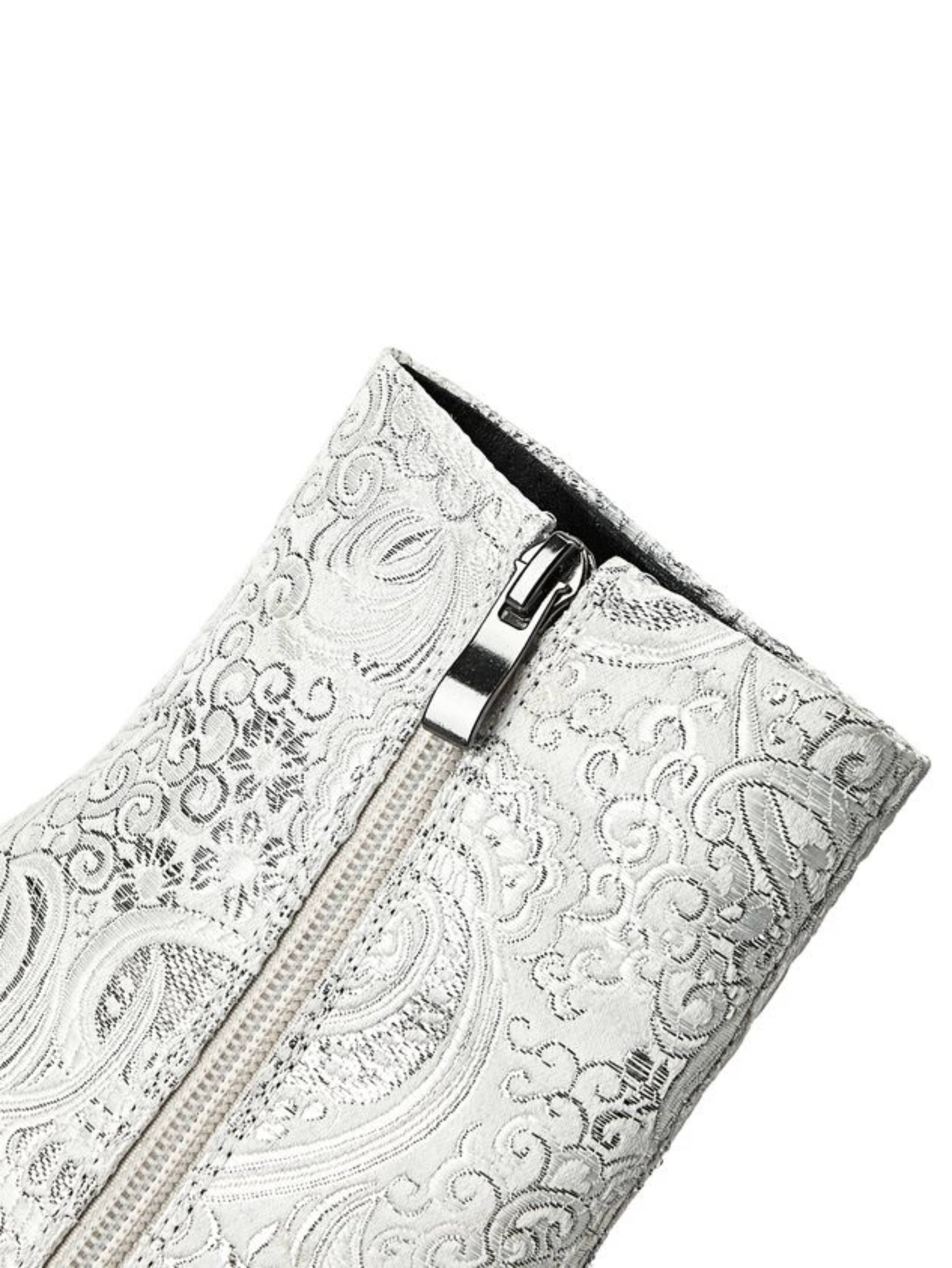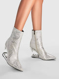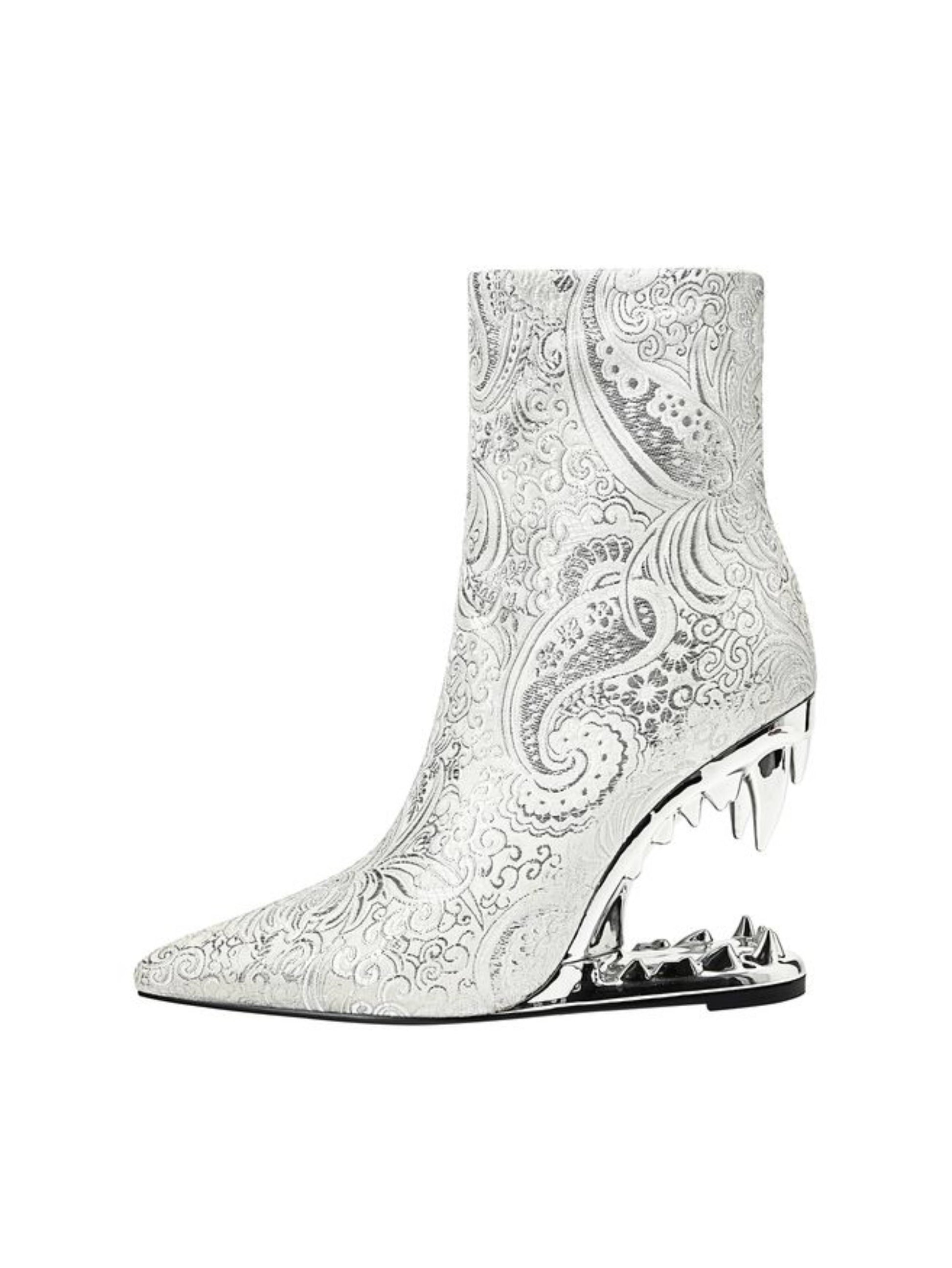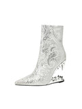 White and Silver Floral Tiger Teeth Heel Pointed Toe Short Boots