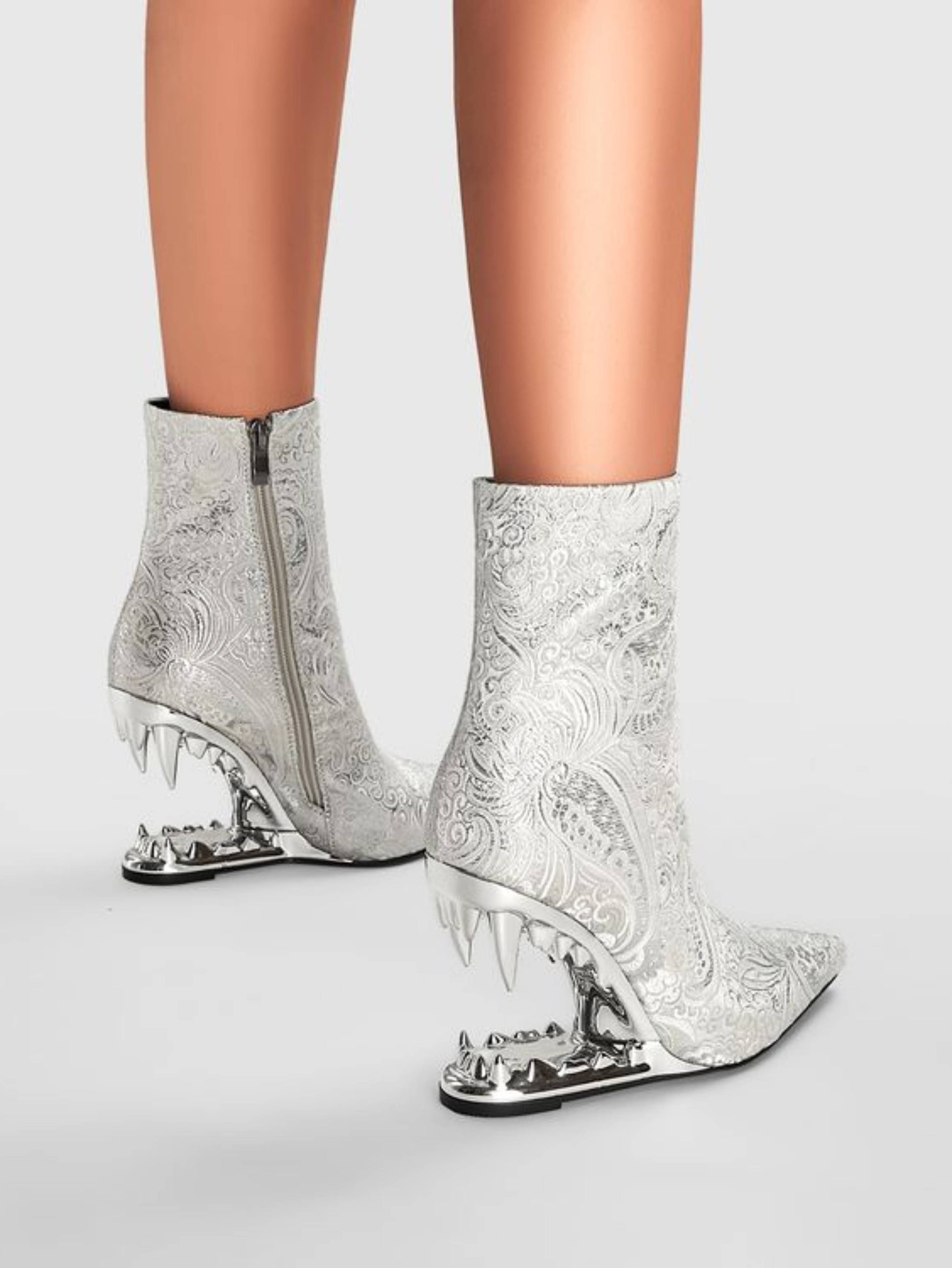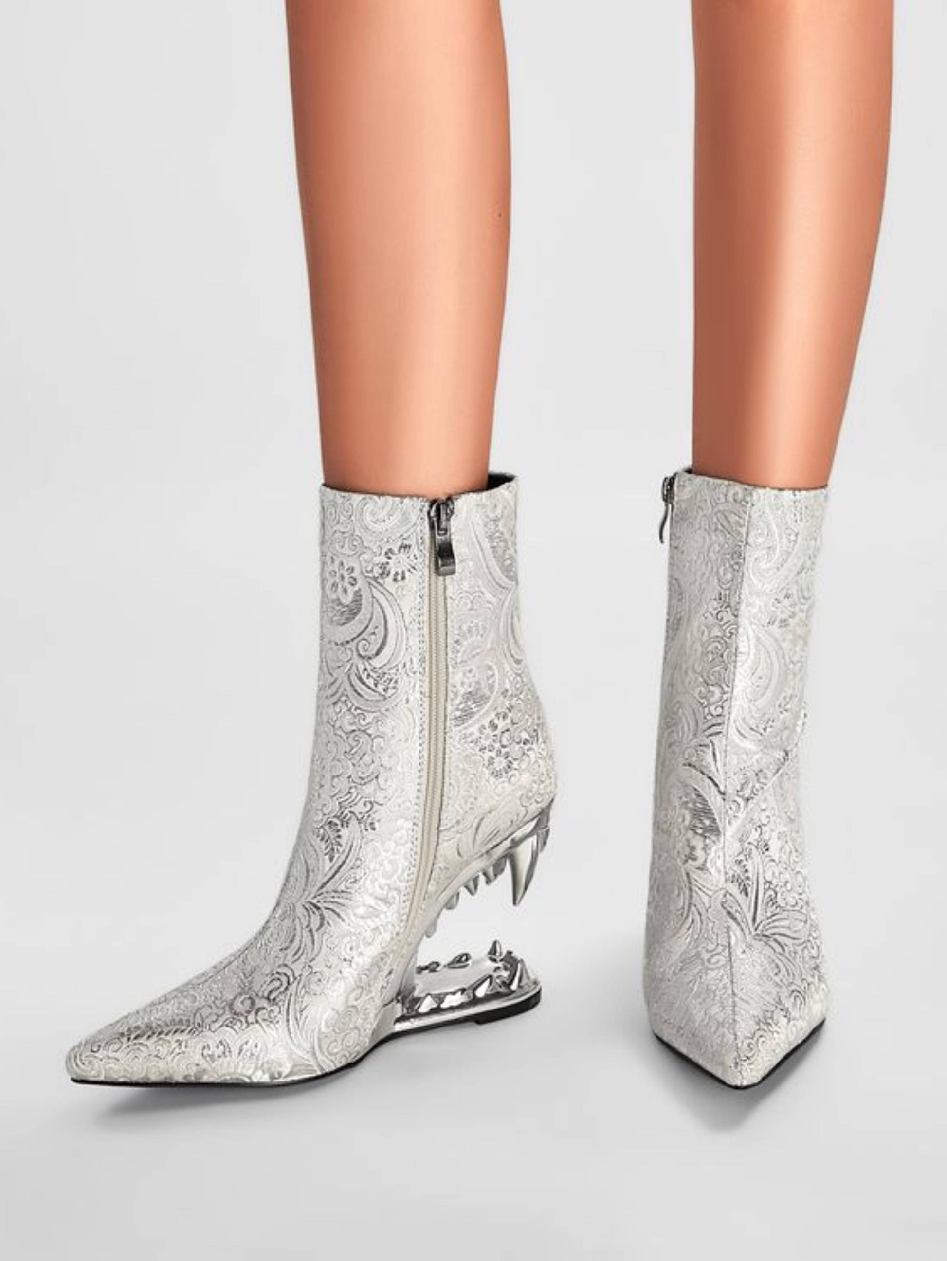 Stunning white and silver floral short boots featuring unique tiger teeth heel design and elegant pointed toe. These chic metallic accent boots blend delicate floral embellishments with sculptural heels, ideal for sophisticated floral ankle boots and trendy silver white bootie styles.