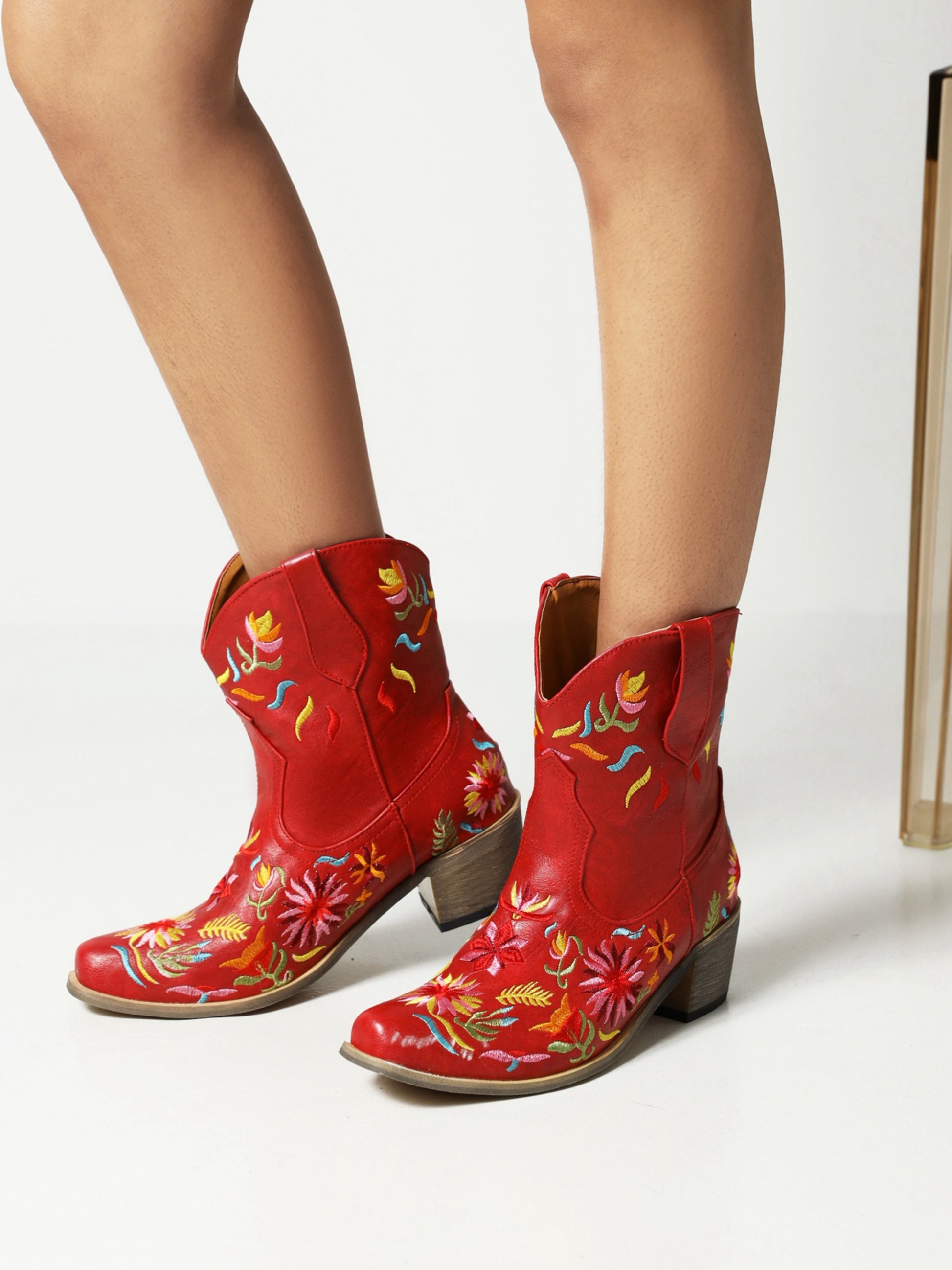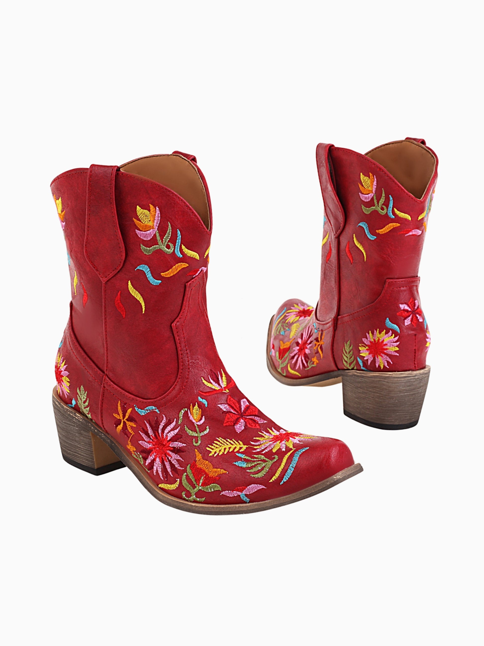 Playful Floral Embroidered Red Western Cowgirl Ankle Boots for Women