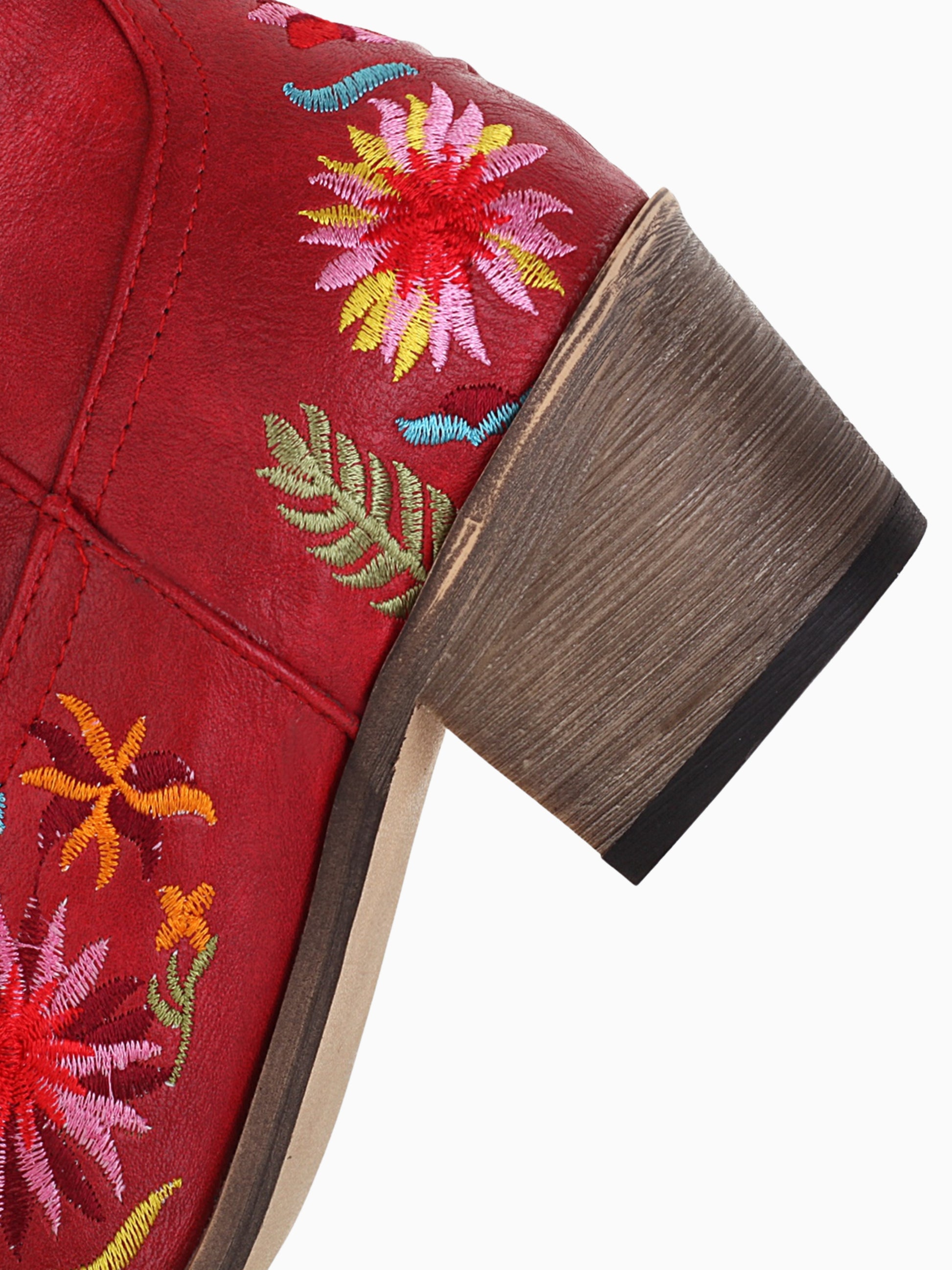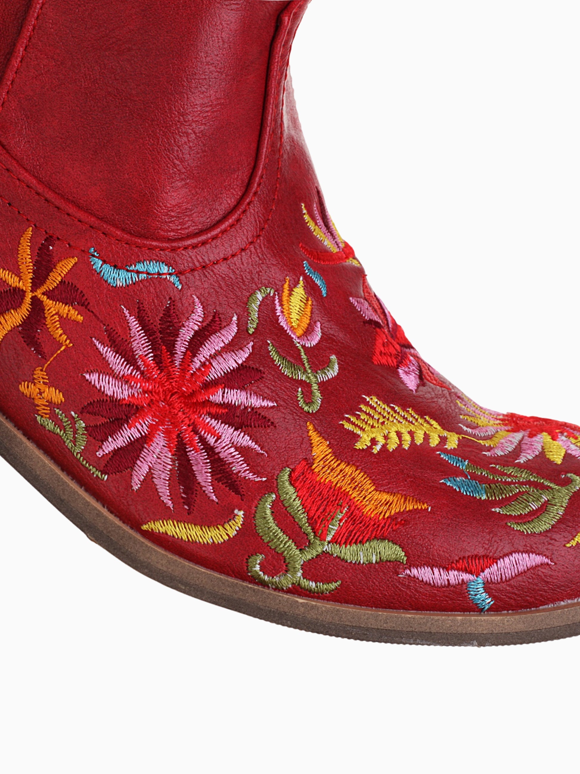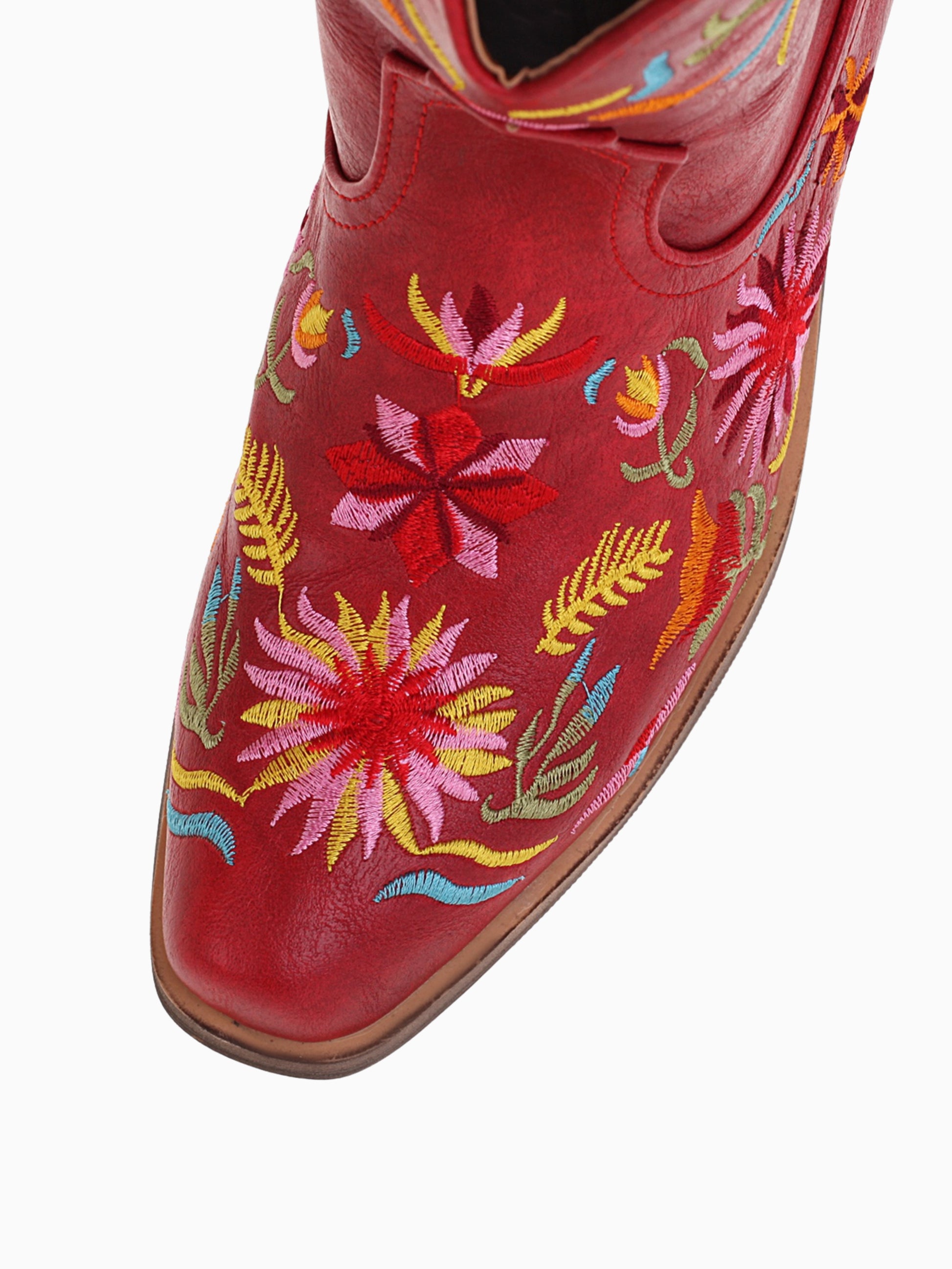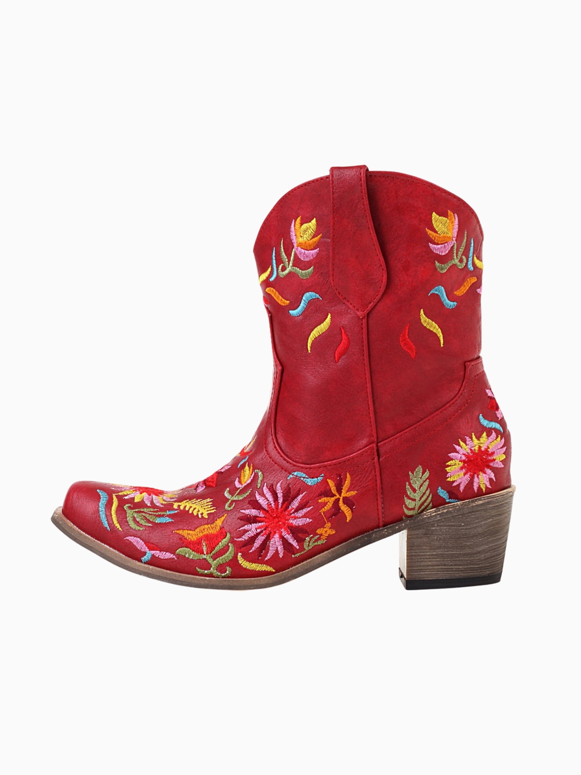 Vibrant Western ankle boots in red featuring colorful wildflower embroidery with multi-colored blooms and playful leaf designs.