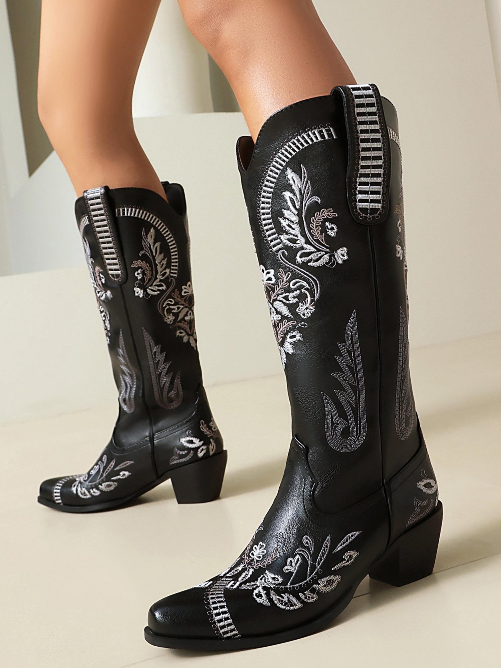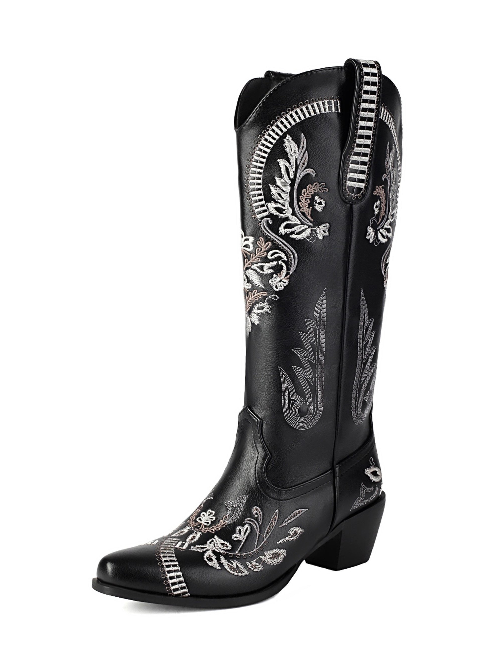 These striking women's black cowboy boots feature elegant floral embroidery that creates a beautiful contrast against the rich black. The intricate embroidery showcases delicate blooms and vines in vibrant colors that climb gracefully along the shaft and vamp.