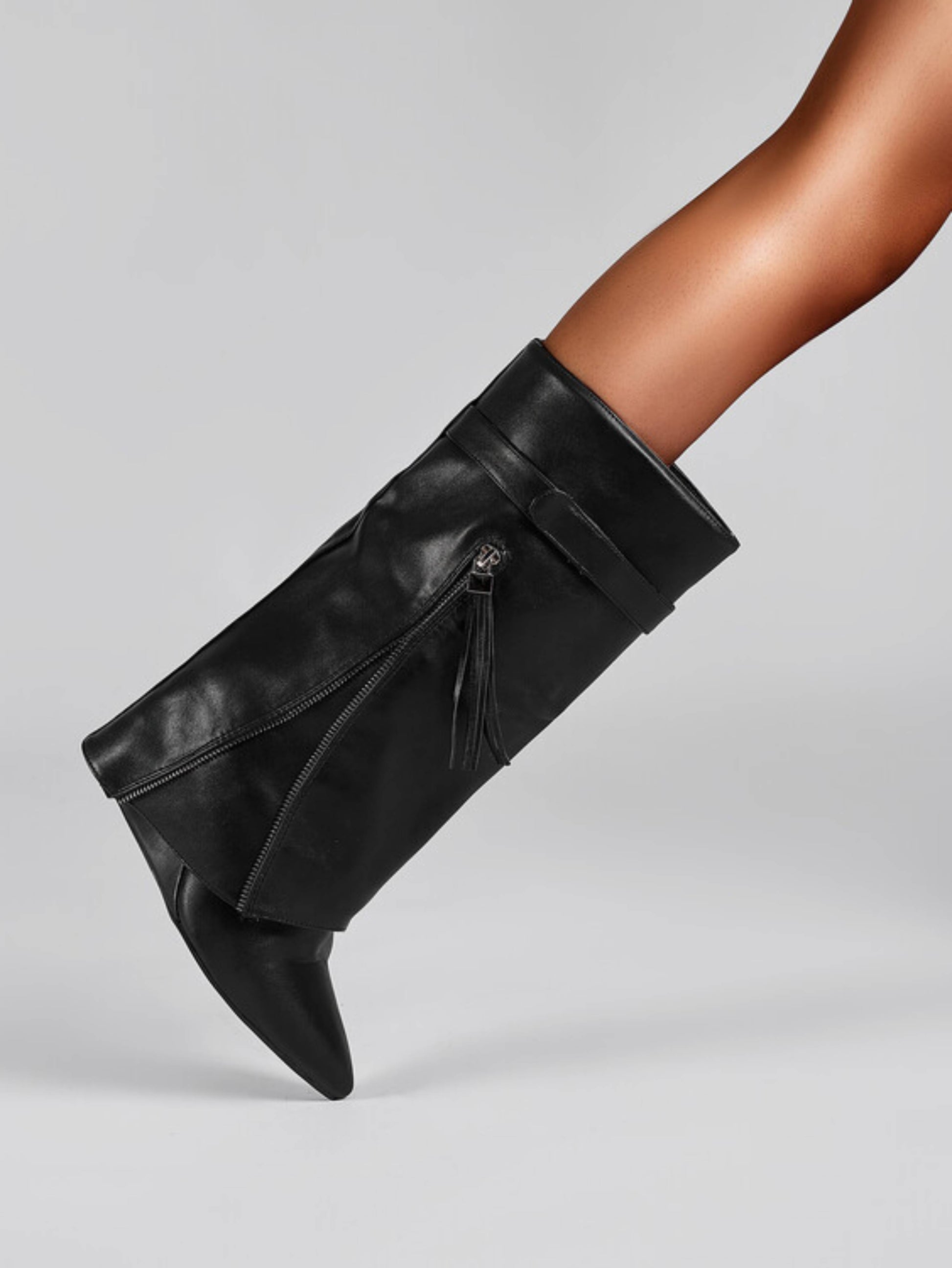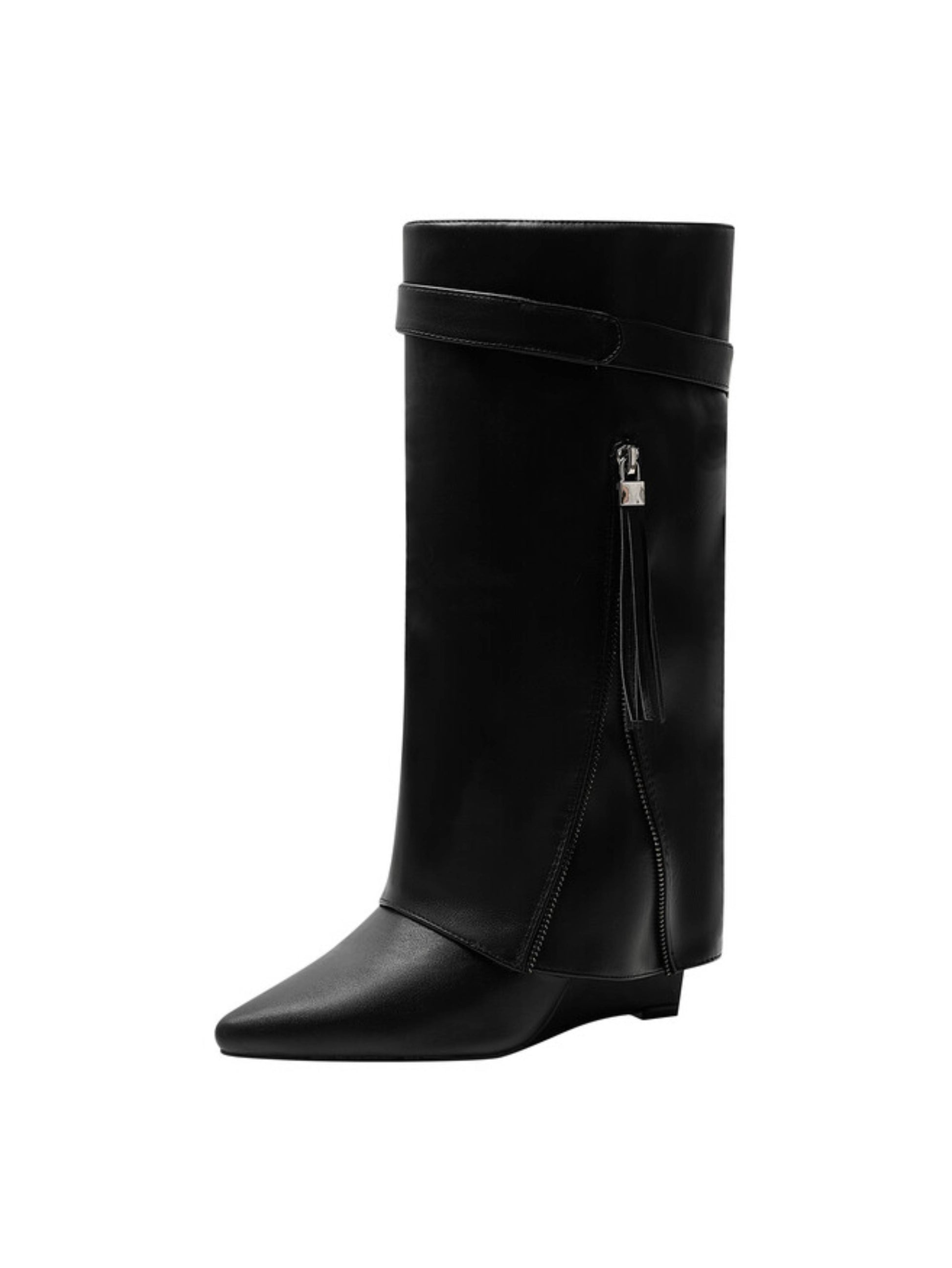 Elevate your style with these women's black fold-over tall boots featuring a sleek wedge high heel and pointed toe. Perfect for adding sophistication to any outfit while ensuring all-day comfort and versatility.