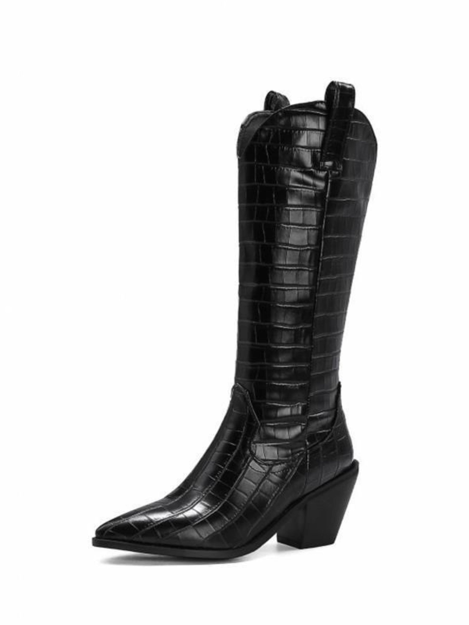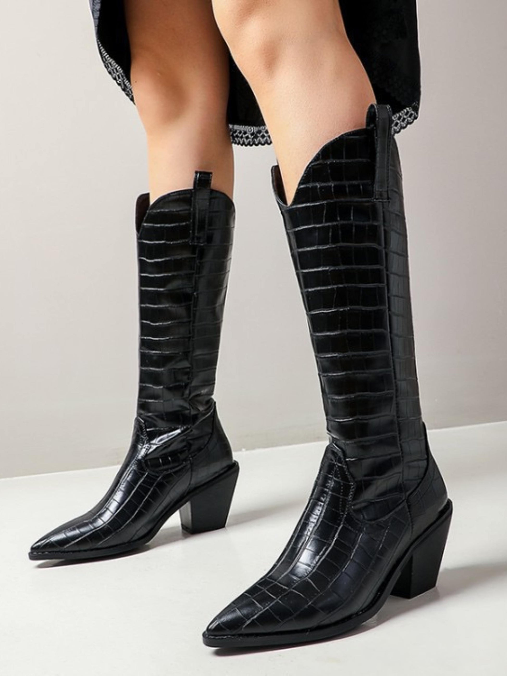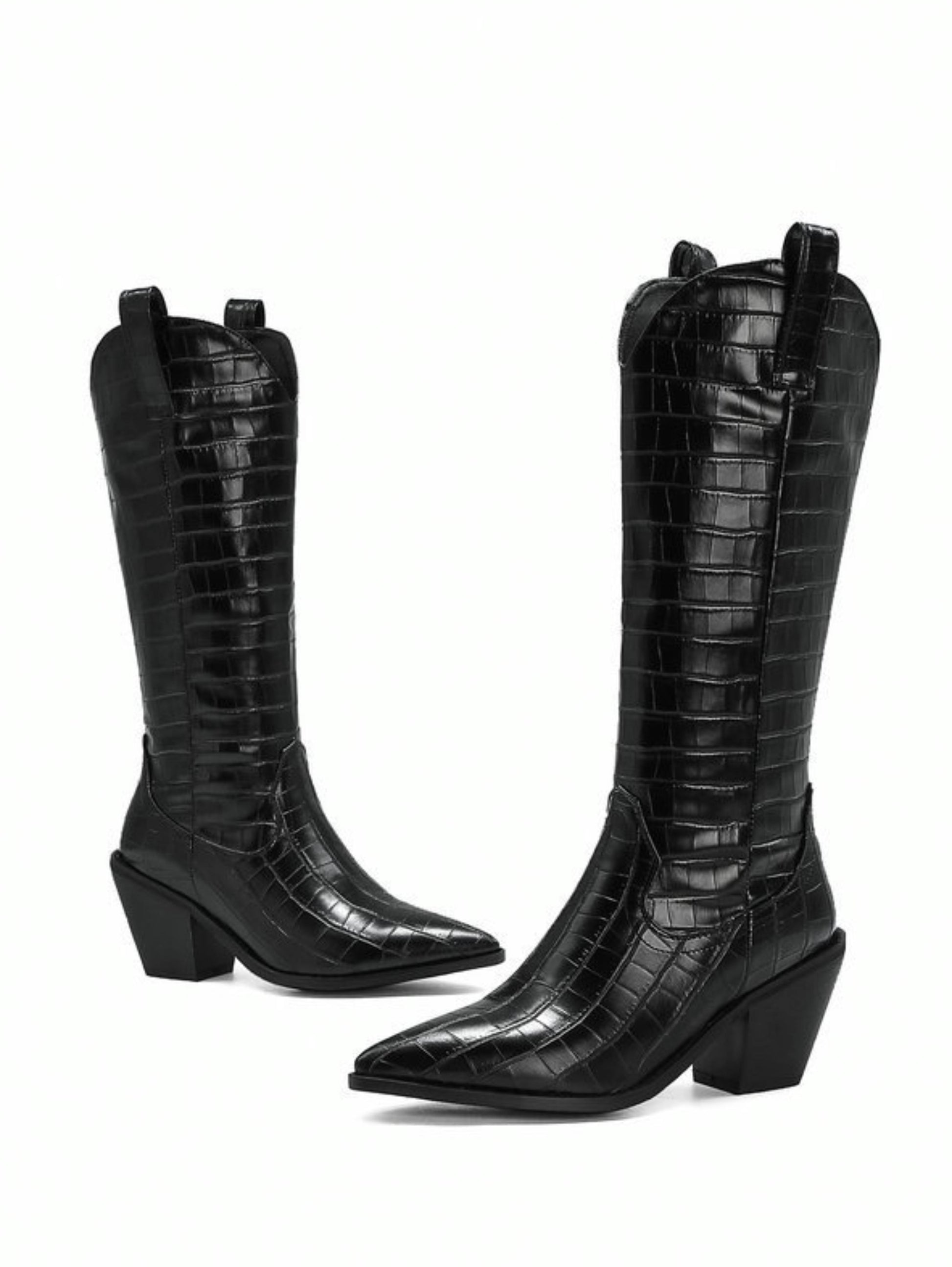 The mid-calf classic western silhouette includes decorative stitching along the shaft and a gently pointed toe that balances style with comfort. The perfect-height stack heel (approximately 3 inches) provides an elegant lift while maintaining stability.