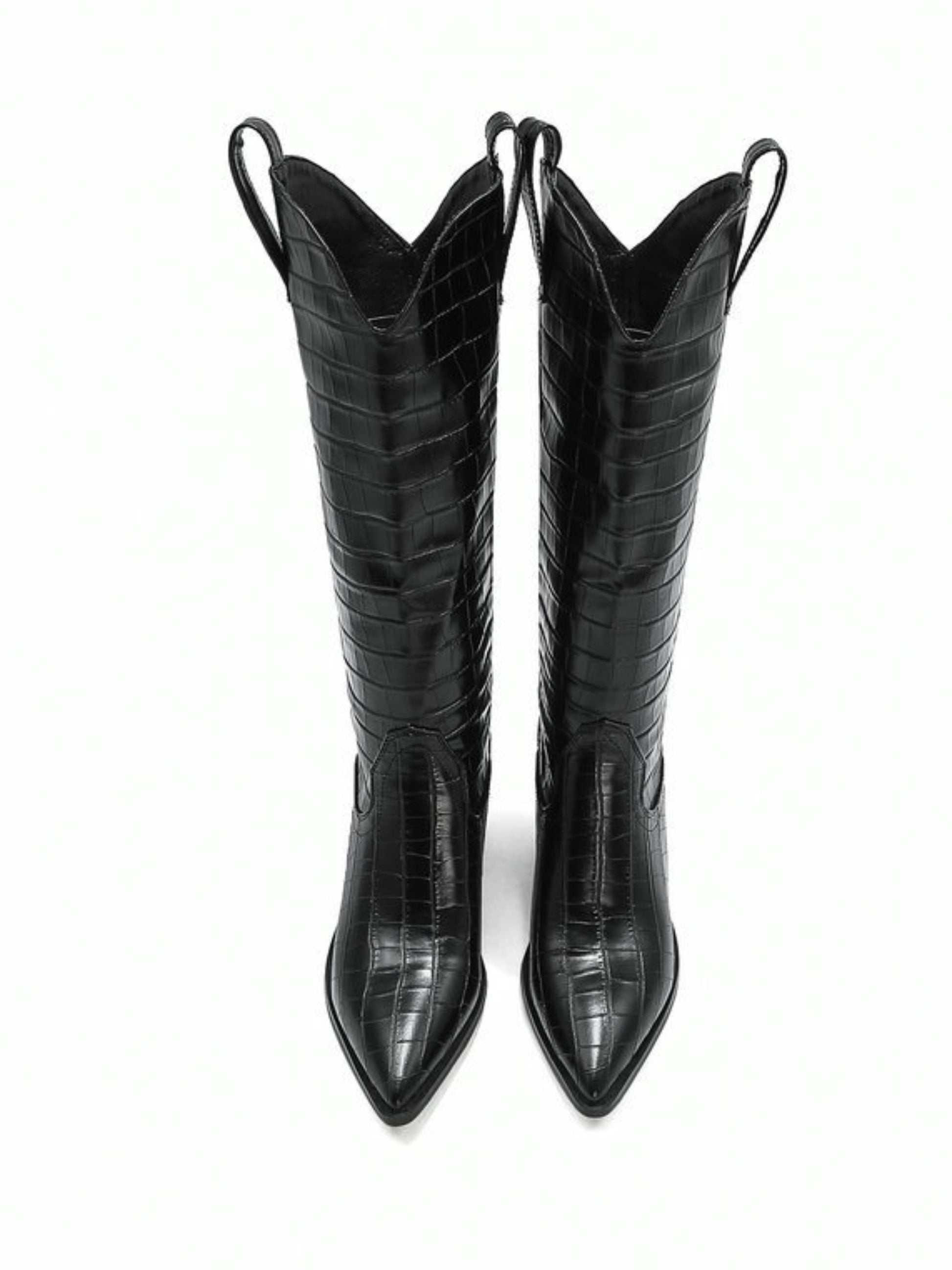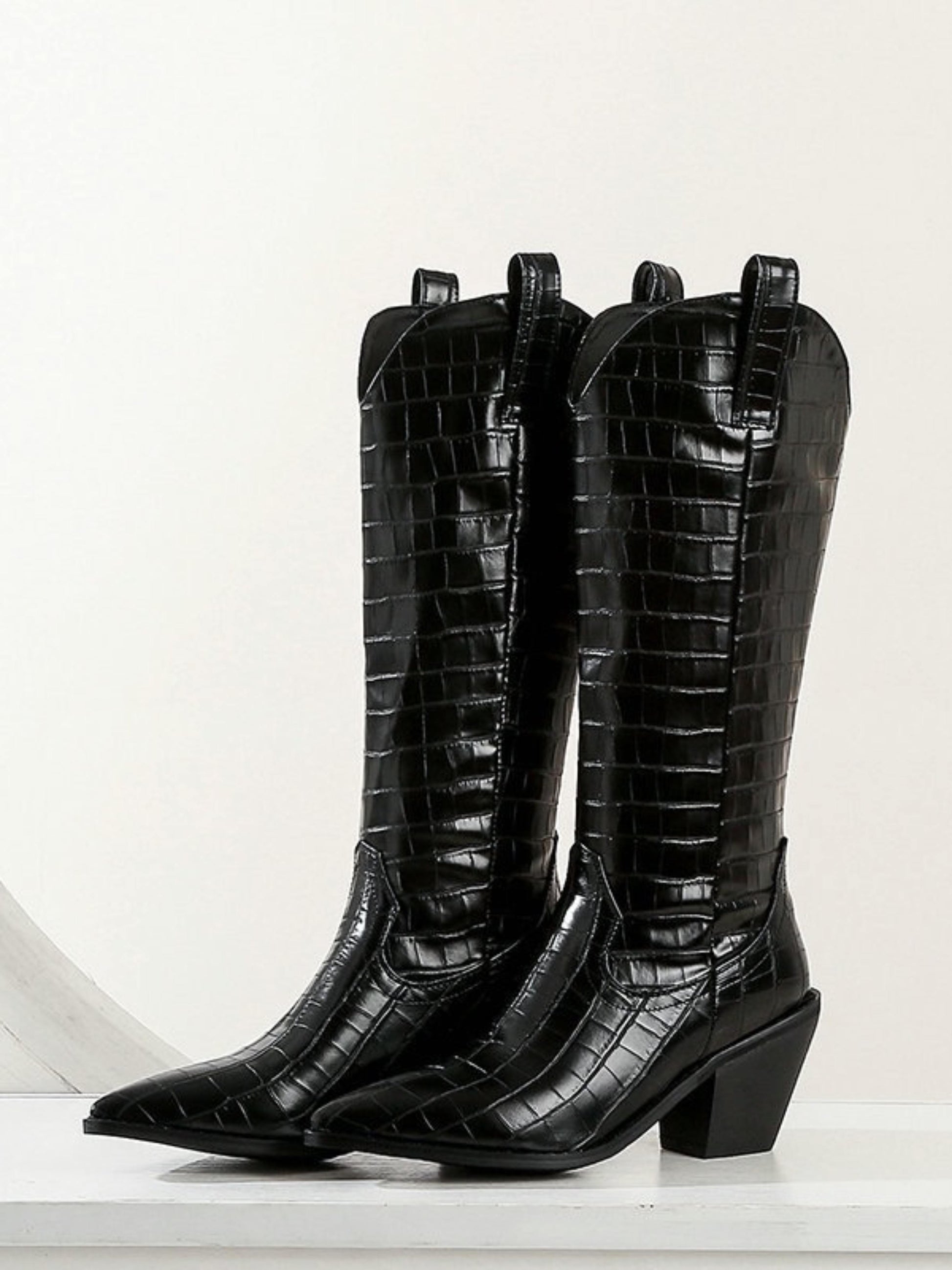Women's Lizard Pattern Heeled Charm Black Western Boots