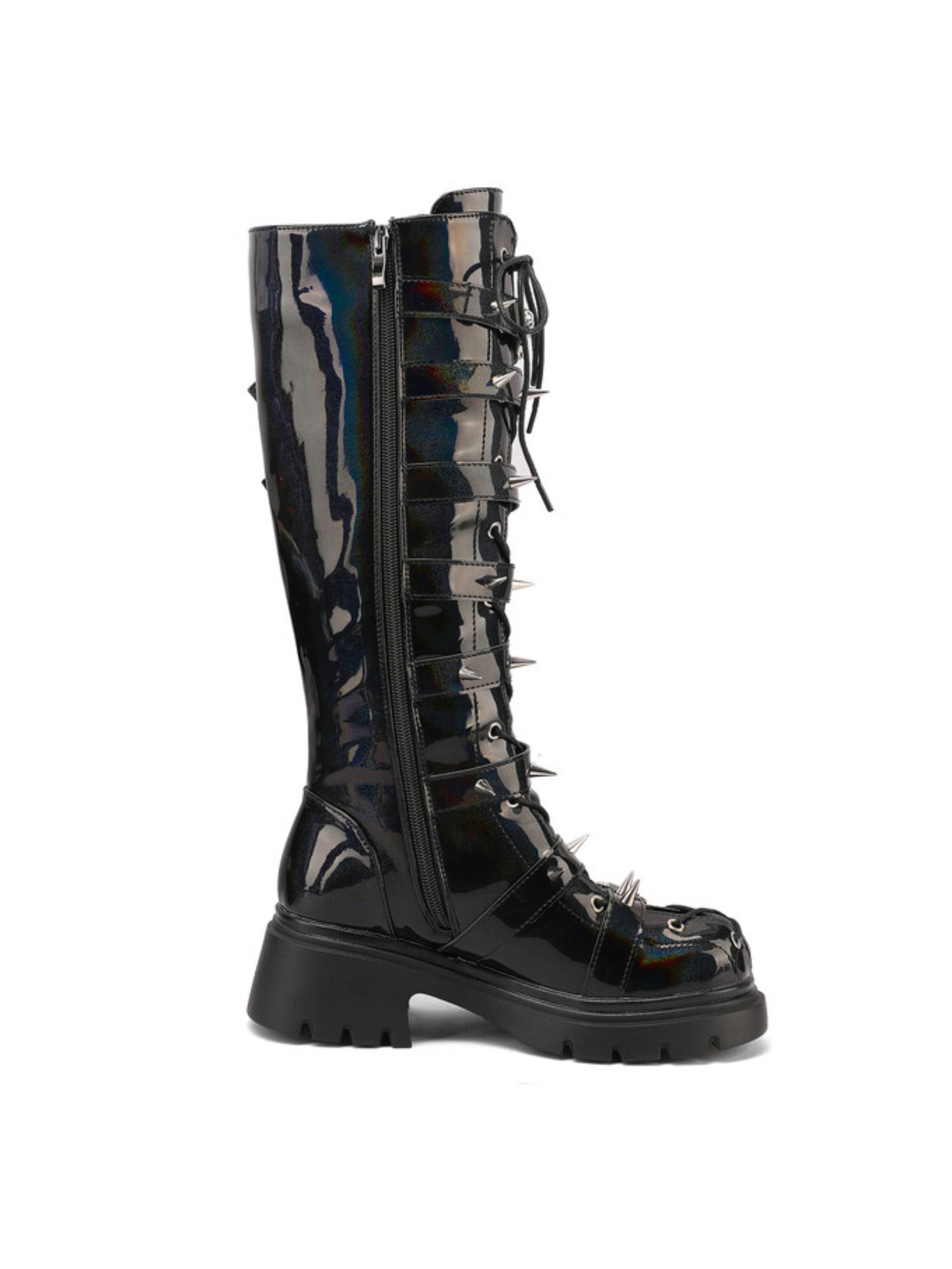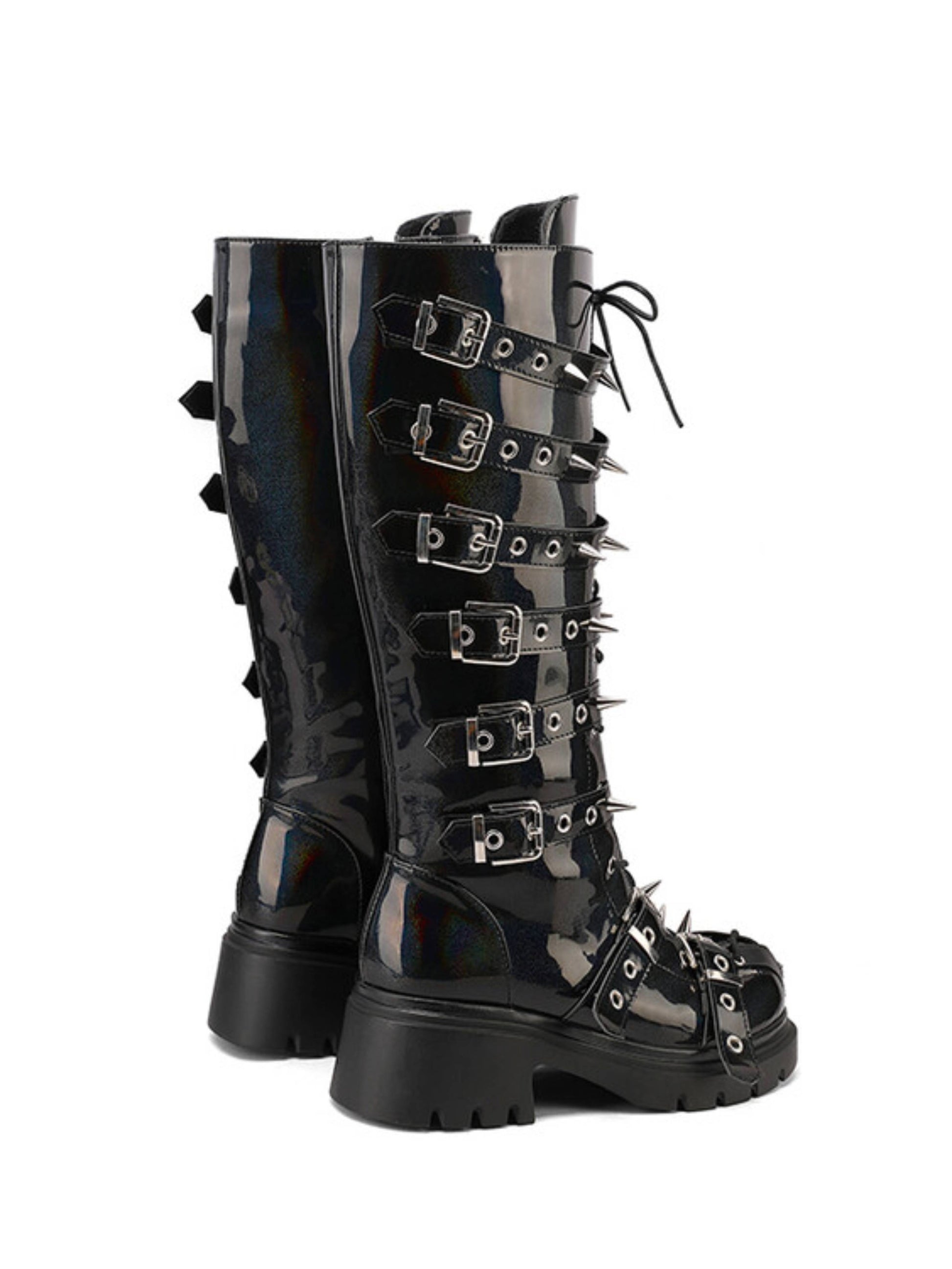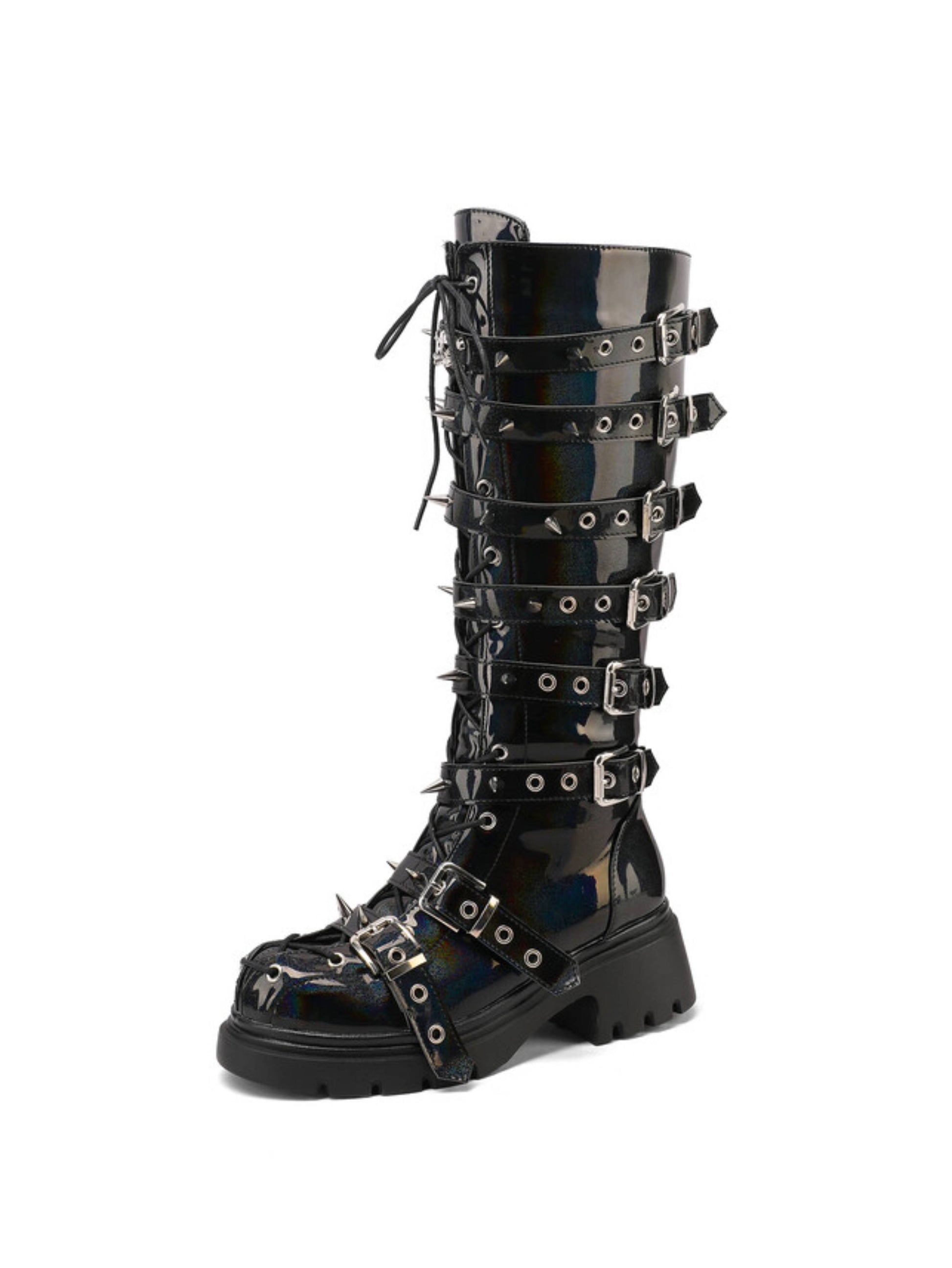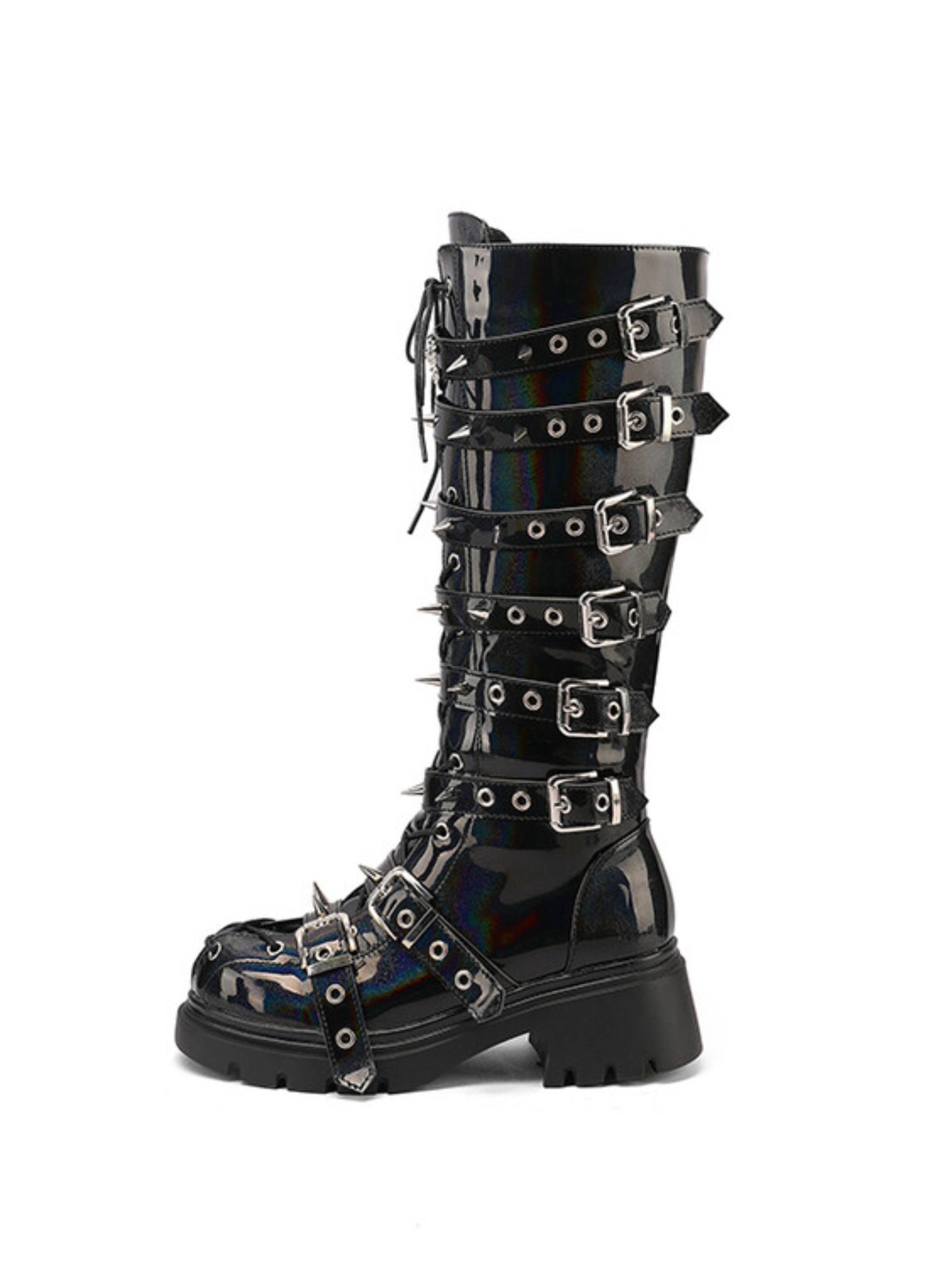 Bold black tall gothic boots featuring edgy rivet studs, buckled straps, lace-up front, and convenient side zipper closure. These statement boots blend punk rock style with dark gothic aesthetics, perfect for alternative fashion lovers seeking studded lace-up boots and dramatic tall gothic footwear.