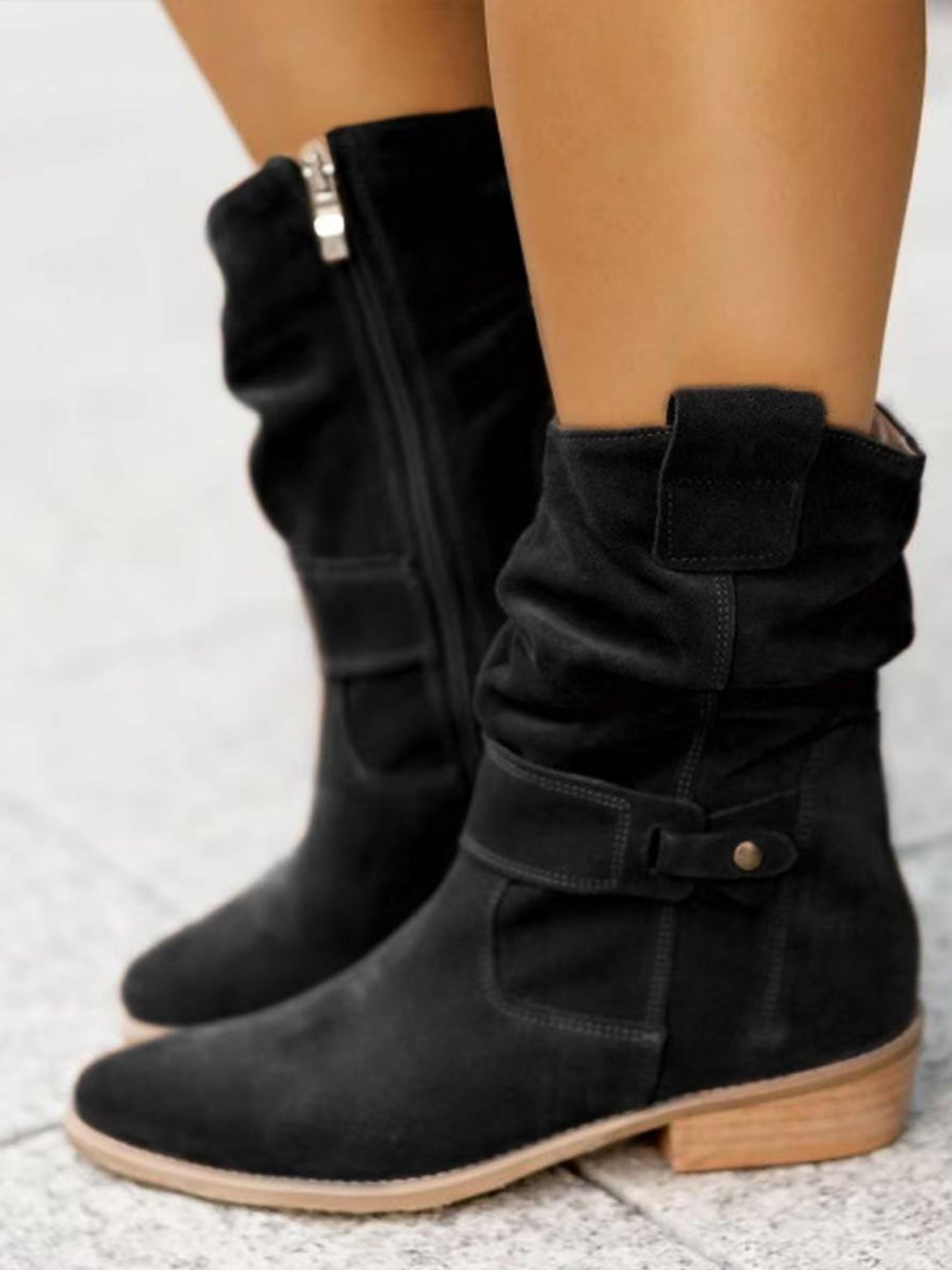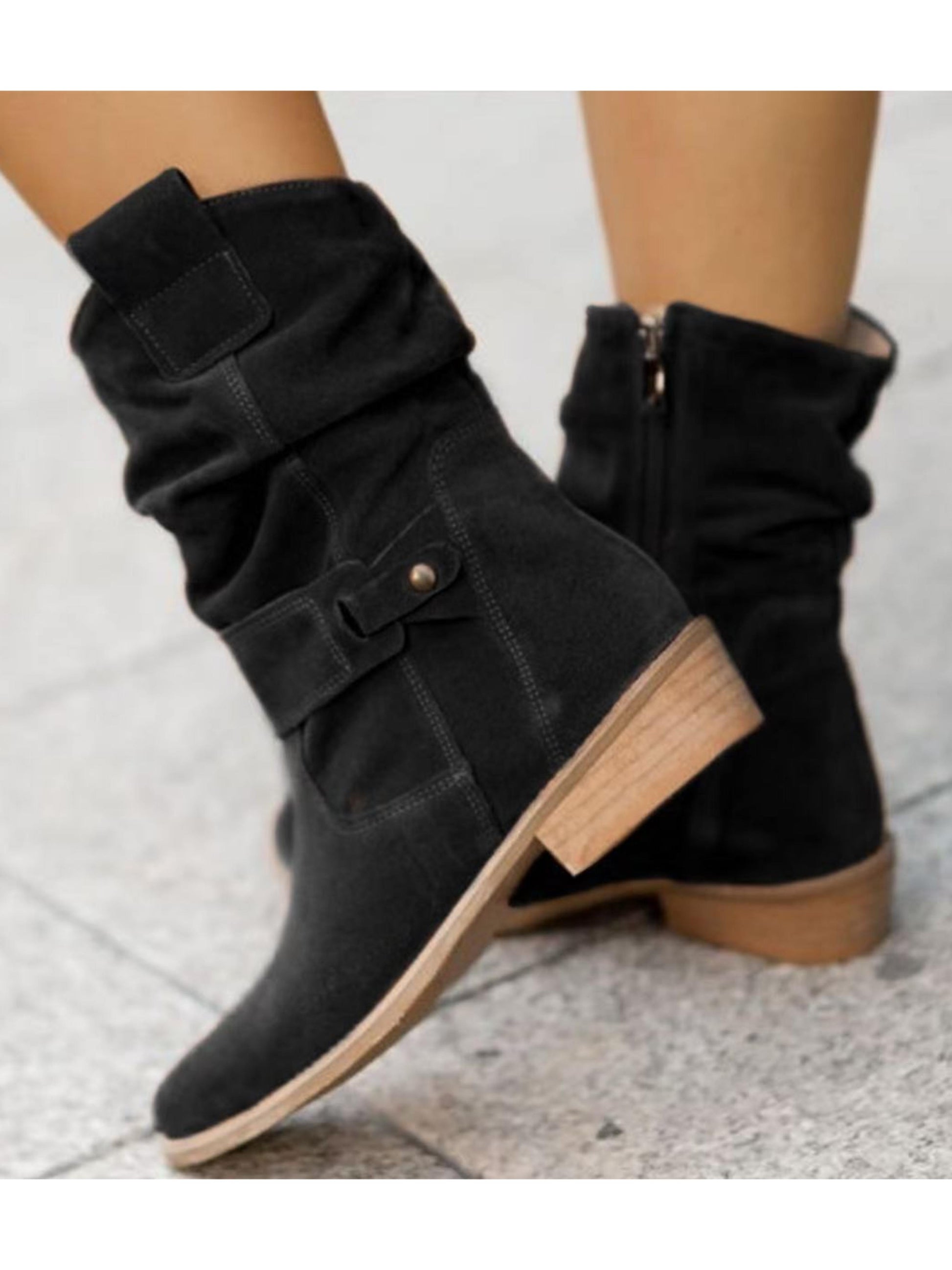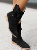 Women's classic black cowgirl boots featuring wrinkled texture and flat heel design for maximum comfort. Timeless western boots perfect for casual outfits, country concerts, and everyday wear, combining versatile black color with authentic cowgirl style and all-day wearability.